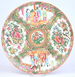 #299Een Chinees porsleinen bord met bloemen en figuren. (haarscheuren achteraan).