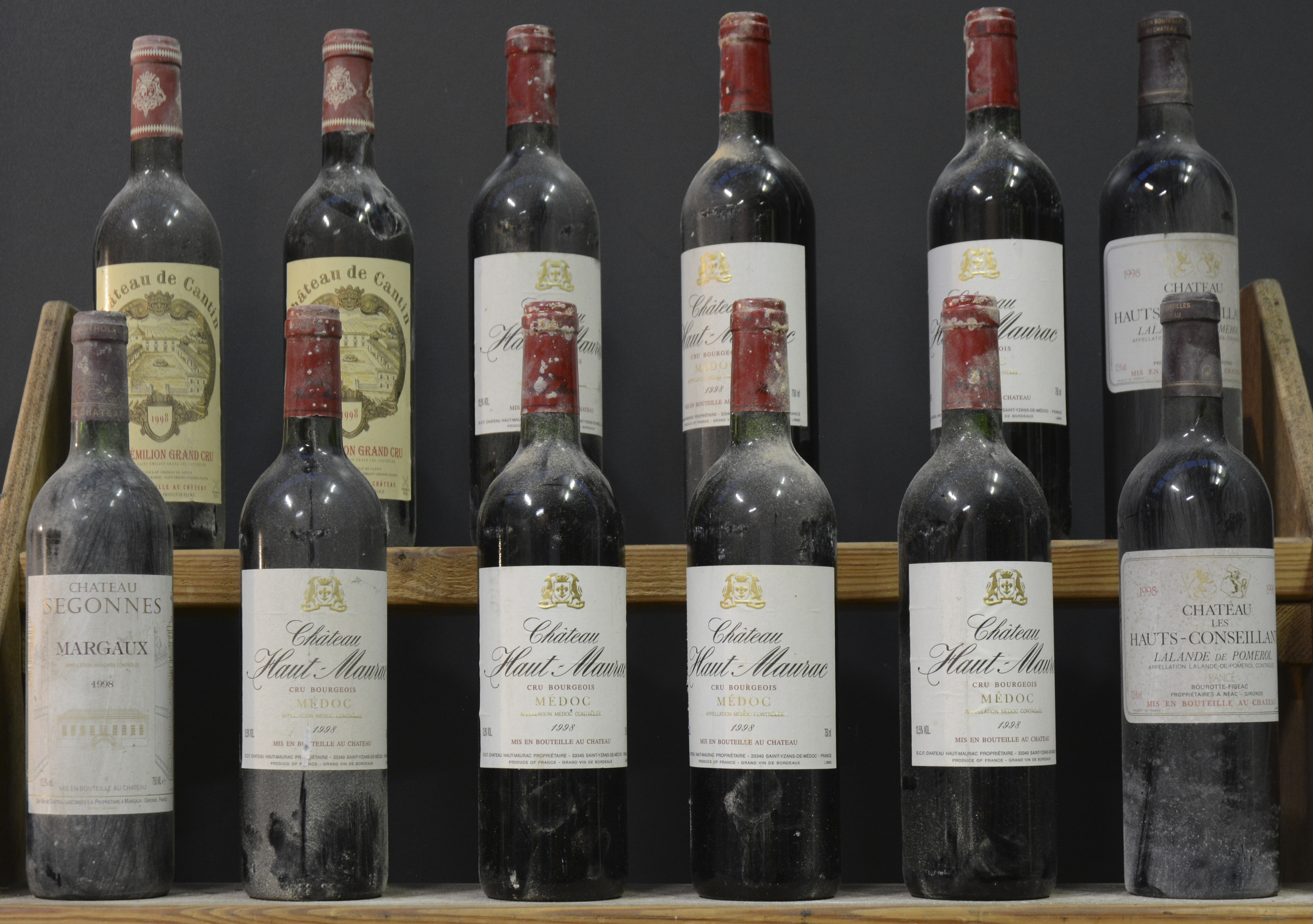 Lot rode bordeaux      1998  aantal: 12 bt    Ch. Haut-Maurac A.C. Médoc Cru bourgeois  M.C.  1998  aantal: 7 bt    Ch. Segonnes A.C. Margaux   M.C.  1998  aantal: 1 bt    Ch. de Cantin A.C. St-Emilion grand cru   M.C.  1998  aantal: 2 bt    Ch. Les Hauts-Conseillants A.C. Lalande-de-Pomerol   M.C.  1998  aantal: 2 bt