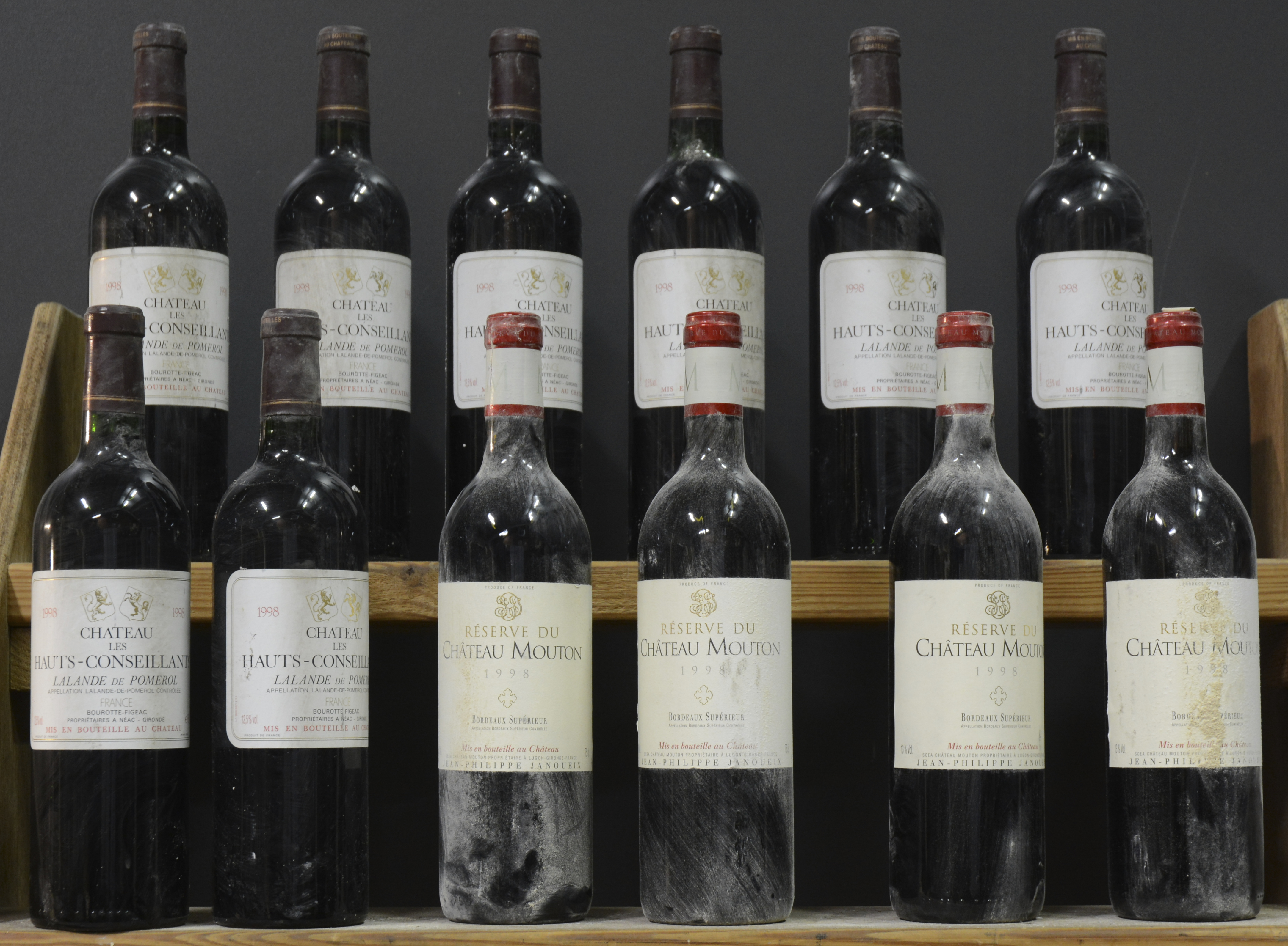Lot rode bordeaux      1998  aantal: 12 bt    Ch. Les Hauts-Conseillants A.C. Lalande-de-Pomerol   M.C.  1998  aantal: 8 bt    Réserve du Ch. Mouton A.C. Bordeaux Supérieur   M.C.  1998  aantal: 4 bt