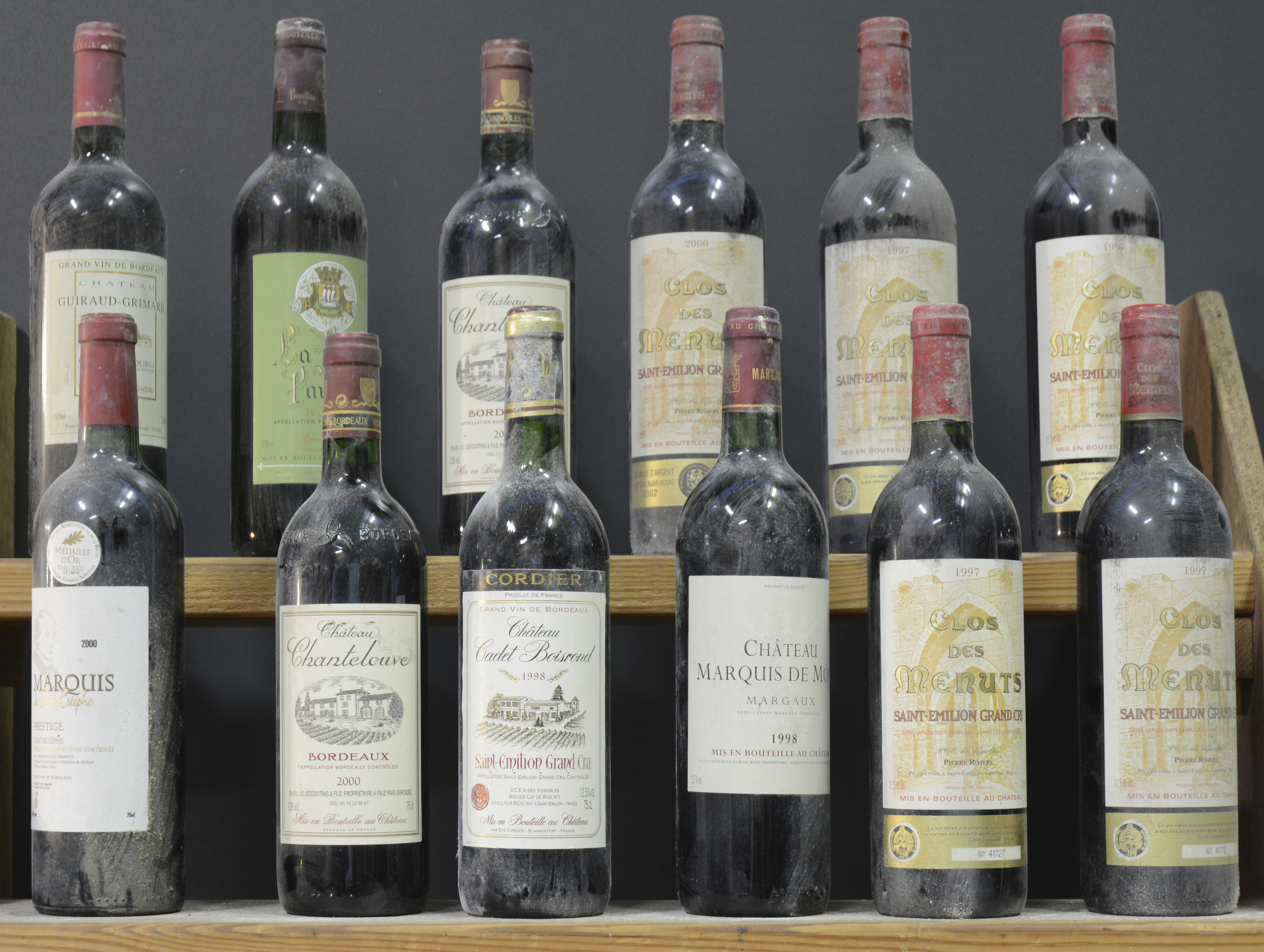 Lot rode bordeaux        aantal: 12 bt    Clos des Menuts A.C. St-Emilion grand cru   M.C.  1997  aantal: 5 bt    Ch. Cadet Boisrond A.C. St-Emilion grand cru   M.C.  1998  aantal: 1 bt    Ch. Marquis de Mons A.C. Margaux   M.C.  1998  aantal: 1 bt    Ch. Chantelouve A.C. Bordeaux   M.C.  2000  aantal: 2 bt    Ch. Guiraud-Grimard A.C. Côtes de Bourg   M.C.  2000  aantal: 1 bt    La Rose Pauillac A.C. Pauillac   M.P.  2000  aantal: 1 bt    Marquis de Saint-Estèphe A.C. St-Estèphe   M.P.  2000  aantal: 1 bt