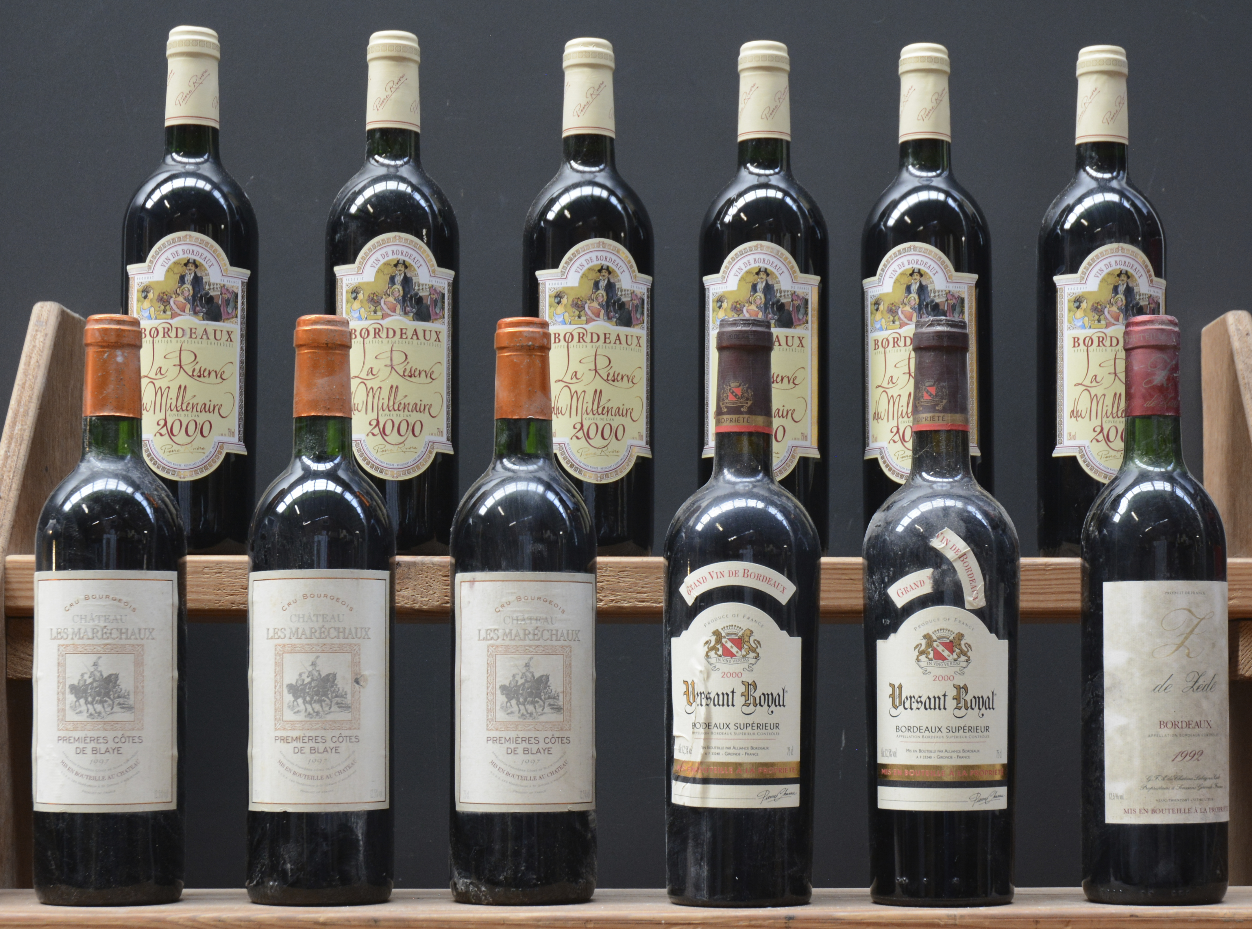 Lot rode bordeaux        aantal: 12 bt    Z de Zédé A.C. Bordeaux   M.P.  1992  aantal: 1 bt    Versant Royal A.C. Bordeaux Supérieur   M.P.  2000  aantal: 2 bt    La Réserve du Millénaire A.C. Bordeaux  Pierre Rivière, St-Emilion M.O.  2000  aantal: 6 bt    Ch. Les Maréchaux A.C. 1e Côtes de Blaye Cru bourgeois  M.C.  1997  aantal: 3 bt