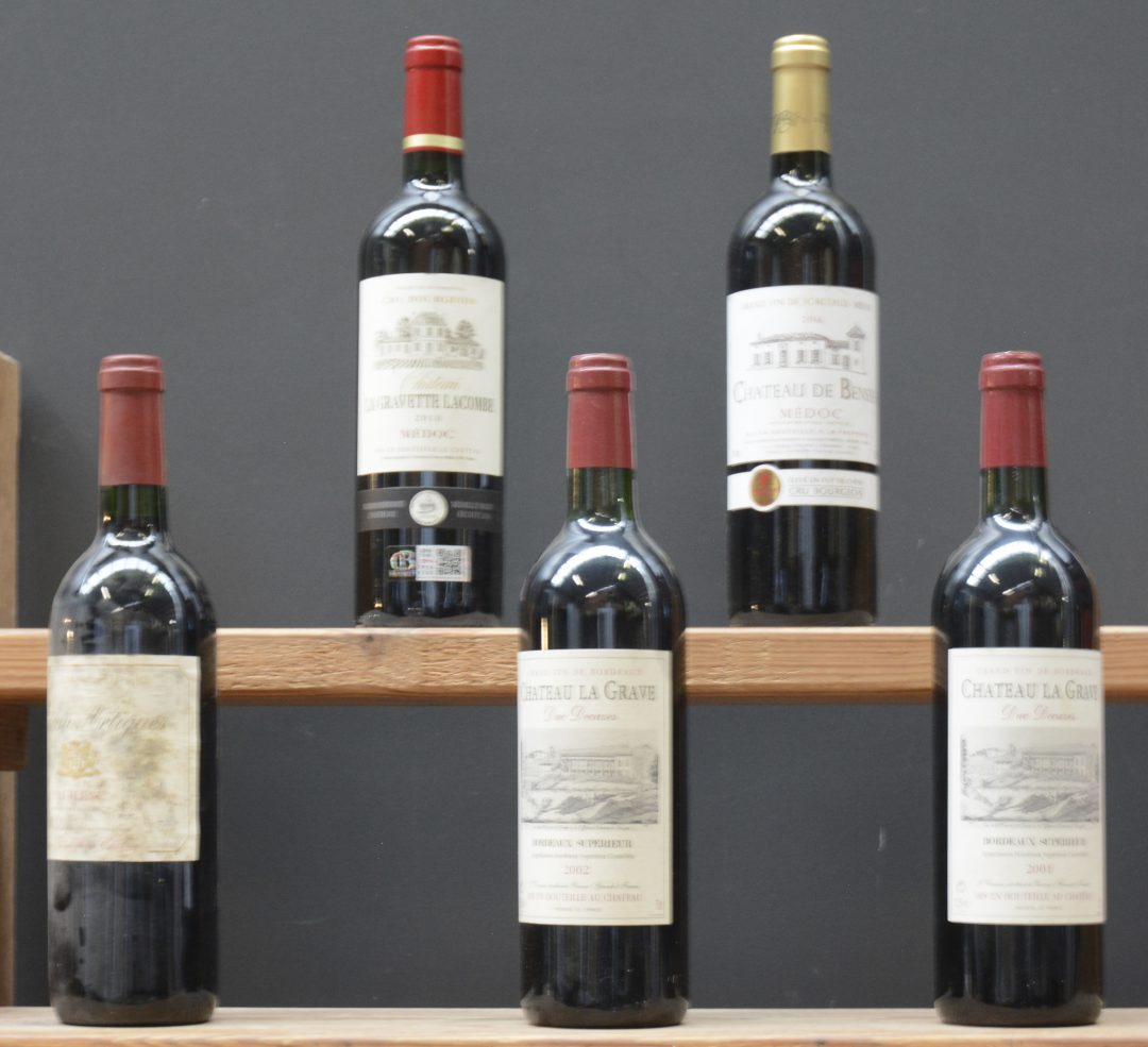 Lot rode bordeaux        aantal: 5 bt    Ch. Artigues A.C. Pauillac Cru bourgeois  M.C.  2001  aantal: 1 bt    Ch. La Grave A.C. Bordeaux Supérieur   M.C.  2001  aantal: 1 bt    Ch. La Grave A.C. Bordeaux Supérieur   M.C.  2002  aantal: 1 bt    Ch. La Gravette Lacombe A.C. Médoc Cru bourgeois  M.C.  2010  aantal: 1 bt    Ch. de Bensse A.C. Médoc Cru bourgeois  M.P.  2016  aantal: 1 bt
