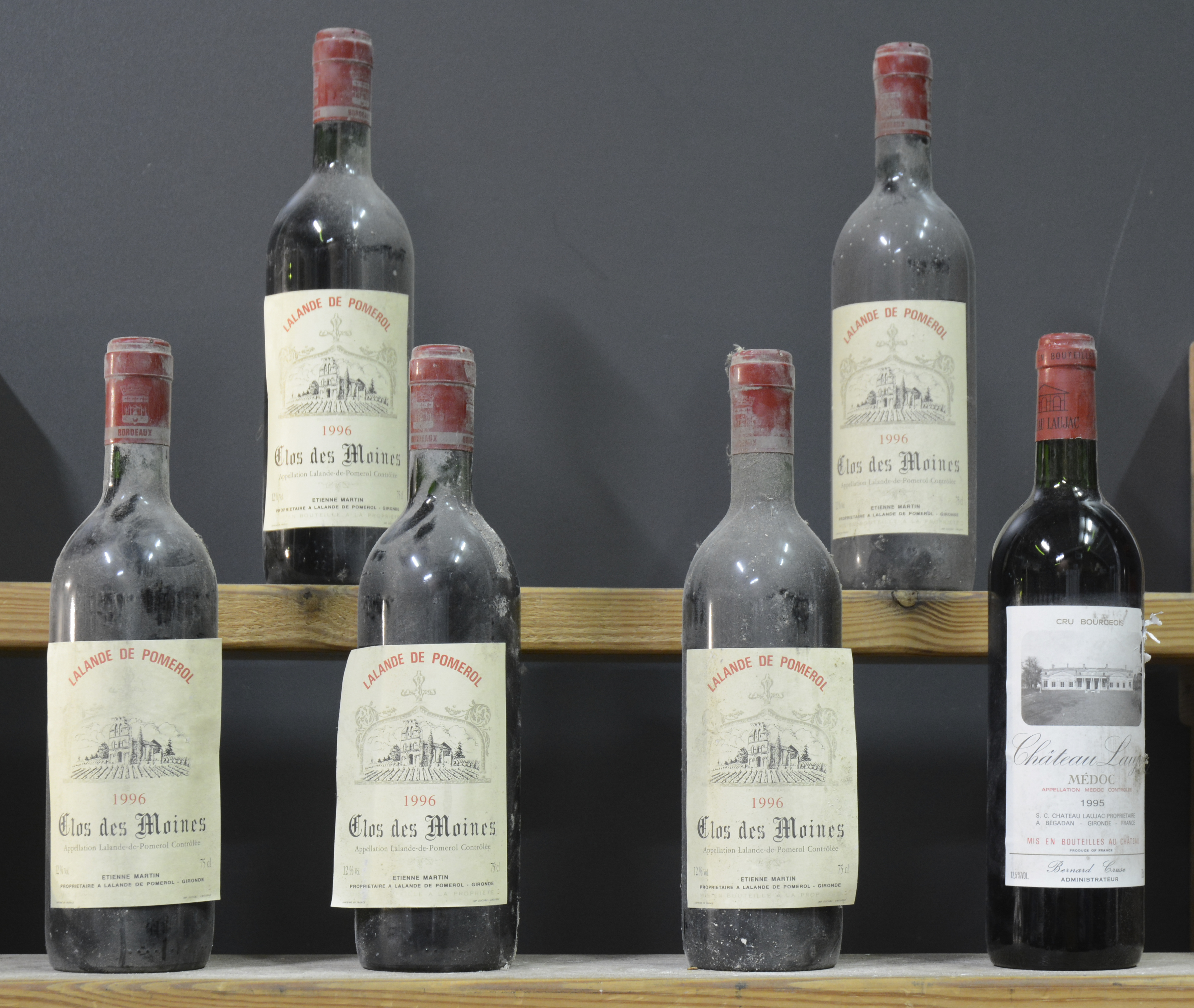 Lot rode bordeaux        aantal: 6 bt    Clos des Moines A.C. Lalande-de-Pomerol   M.O.  1996  aantal: 5 bt    Ch. Laujac A.C. Médoc Cru bourgeois  M.C.  1995  aantal: 1 bt