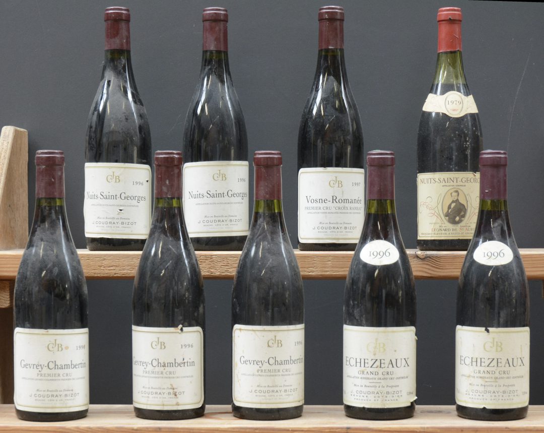 Lot rode bourgogne        aantal: 9 bt    Nuits-Saint-Georges A.C.  Léonard de Saint-Aubin, Nuits M.O.  1979  aantal: 1 bt    Gevrey-Chambertin 1e Cru A.C.  J. Coucray-Bizot Beaune M.D.  1996  aantal: 1 bt    Echezeaux A.C. Grand cru J. Coucray-Bizot Beaune M.D.  1996  aantal: 2 bt    Nuits-Saint-Georges A.C.  J. Coucray-Bizot Beaune M.D.  1996  aantal: 2 bt    Vosne-Romanée 1e Cru Croix Rameau A.C.  J. Coucray-Bizot, Beaune M.D.  1997  aantal: 1 bt