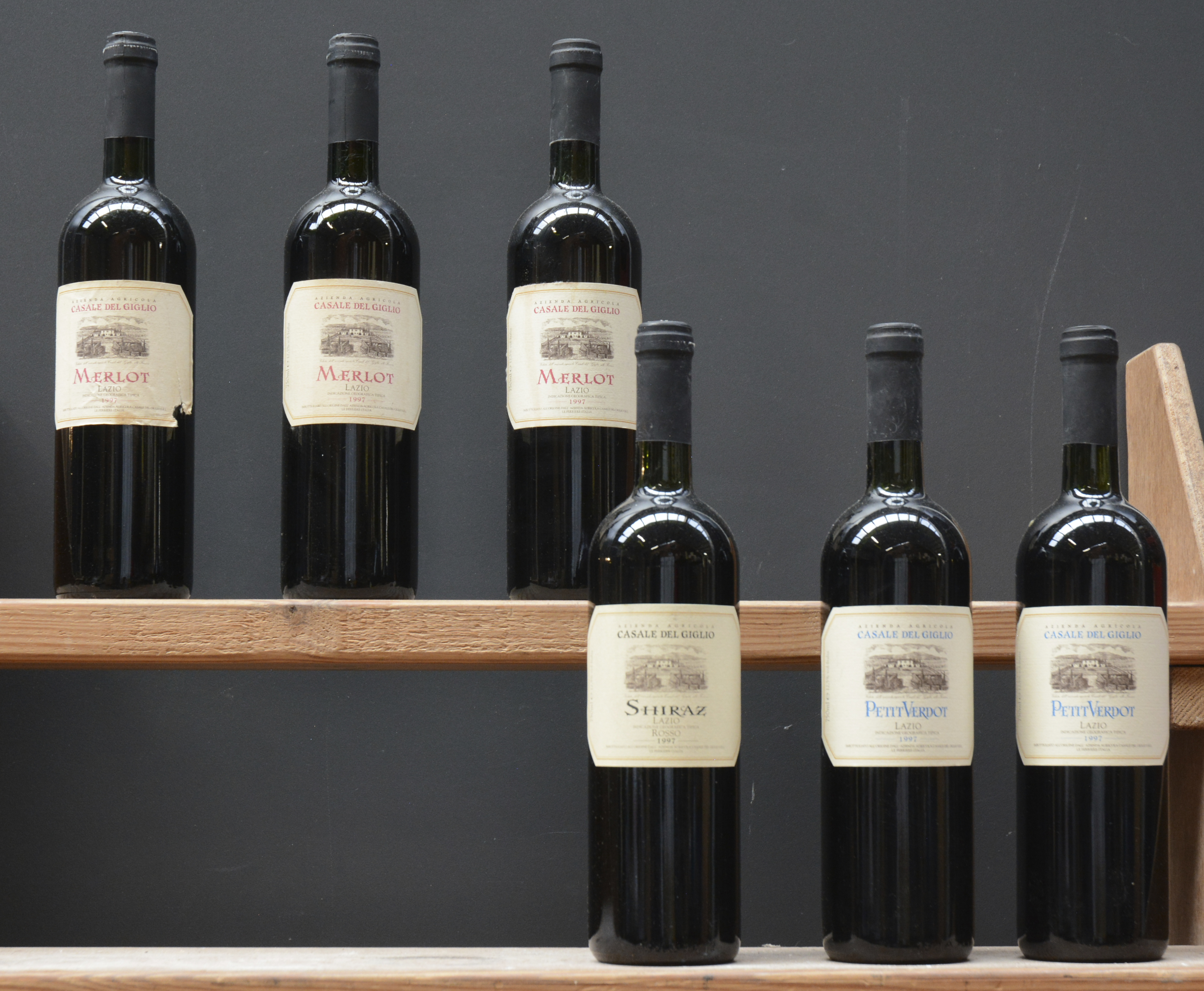 Lot rode wijn      1997  aantal: 6 bt    Petit Verdot I.G.T. Lazio  Casale del Giglio, Le Ferrière M.O.  1997  aantal: 2 bt    Shiraz I.G.T. Lazio  Casale del Giglio, Le Ferrière M.O.  1997  aantal: 1 bt    Merlot I.G.T Lazio  Casale del Giglio, Le Ferrière M.O.  1997  aantal: 3 bt