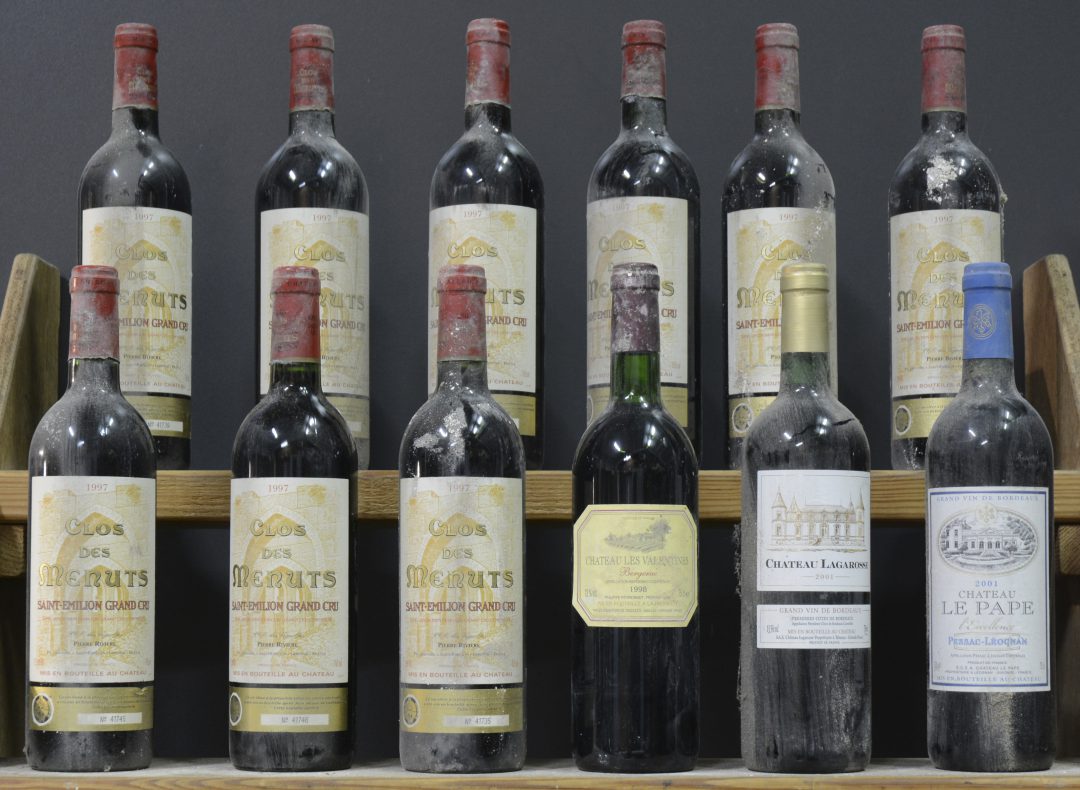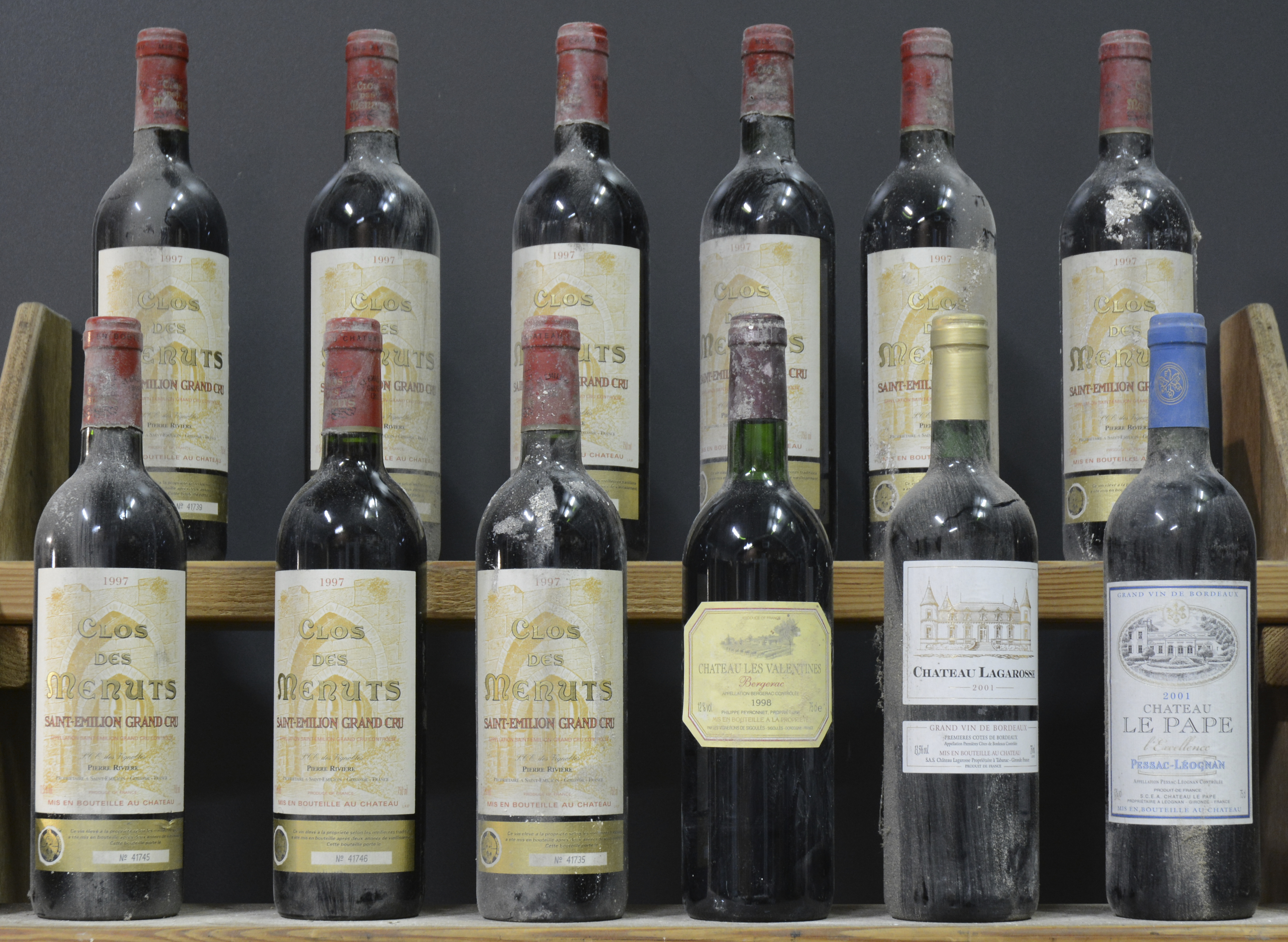 Lot rode wijn        aantal: 12 bt    Clos des Menuts A.C. St-Emilion grand cru   M.C.  1997  aantal: 9 bt    Ch. Les Valentines A.C. Bergerac   M.C.  1998  aantal: 1 bt    Ch. Lagarosse A.C. 1e Côtes de Bordeaux   M.C.  2001  aantal: 1 bt    Ch. Le Pape A.C. Pessac-Léognan   M.C.  2001  aantal: 1 bt