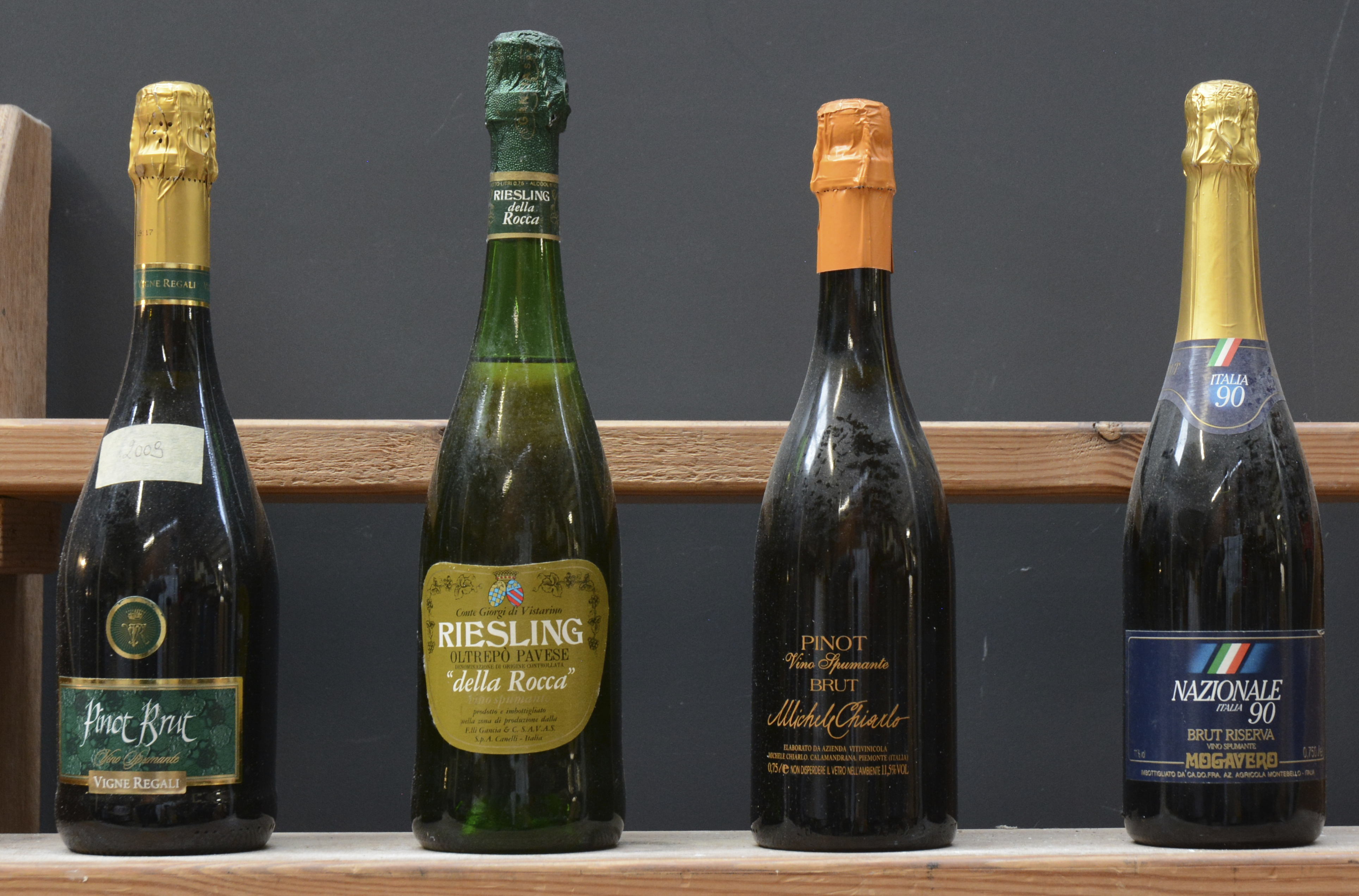 Lot schuimwijn        aantal: 4 bt    Pinot Brut Vigne Regali  Banfi M.O.    aantal: 1 bt    Riesling della Rocca Altrepo Pavese  Elli Gancia M.O.    aantal: 1 bt    Pinot Brut Vino Spumante  Michele Chiarlo M.O.    aantal: 1 bt    Nazionale 90 Brut Riserva  Mogavero M.O.    aantal: 1 bt