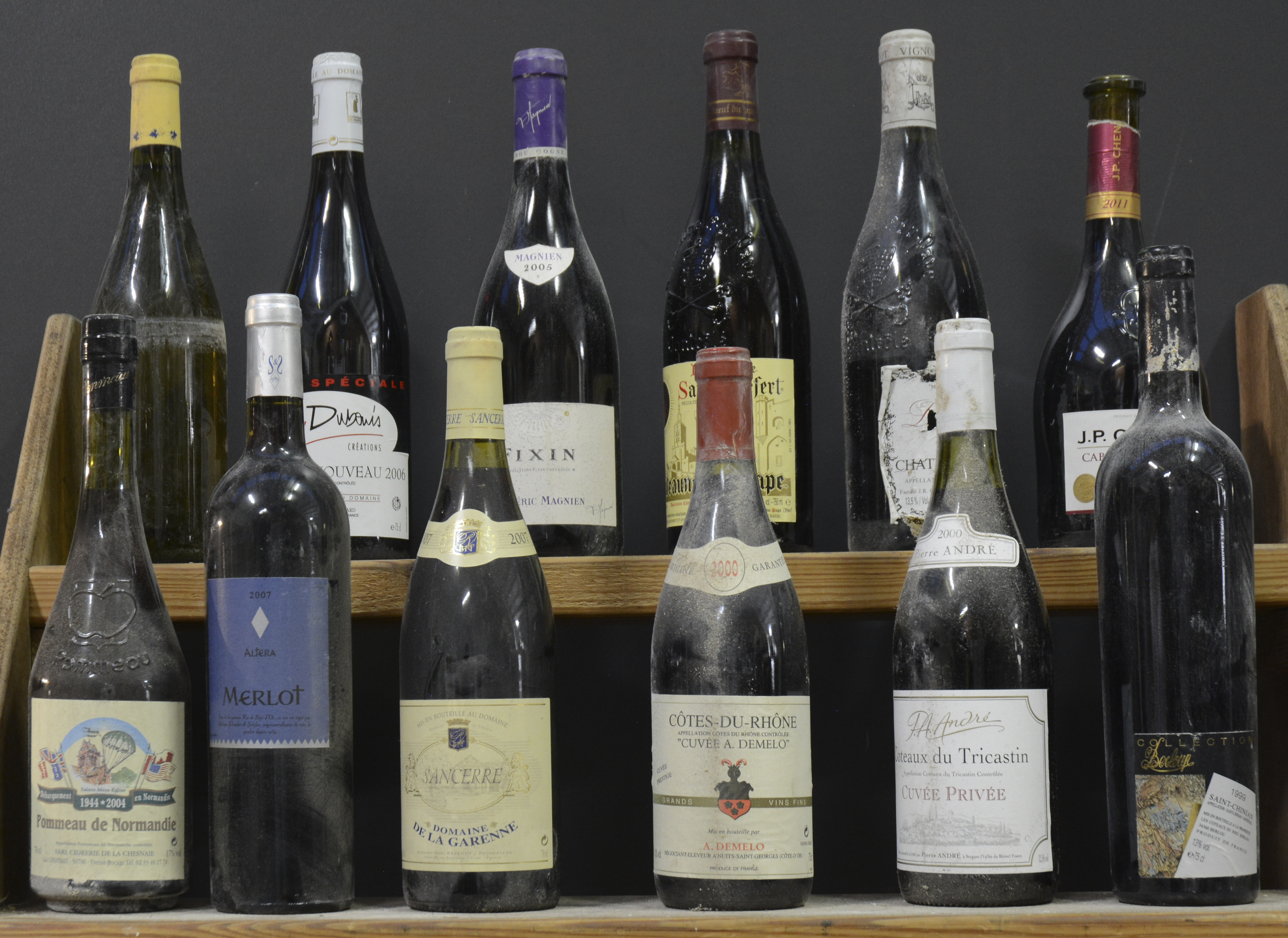 Lot wijn        aantal: 12 bt    Witte wijn zonder etiket        aantal: 1 bt    Beaujolais Nouveau A.C.  Dom. Benoit Trichard, Odenas M.O.  2006  aantal: 1 bt    Châteauneuf-du-Pape A.C.  Dom. de St. Préfert M.O.  1996  aantal: 1 bt    Châteauneuf-du-Pape A.C.  Jérôme Quiot M.O.  1995  aantal: 1 bt    Fixin A.C.  Frédéric Magnien, Morey-St-Denis M.O.  2005  aantal: 1 bt    Dom. de la Garenne A.C. Sancerre   M.O.  2007  aantal: 1 bt    Merlot Vin de Pays d’Oc  Schröder & Schiller M.O.  2007  aantal: 1 bt    Côtes du Rhône A.C.  Cuvée A. Demelo, Nuits M.O.  200  aantal: 1 bt    Coteaux du Tricastin Cuvée Privée A.C.  P.A. André, Sorgues M.O.  2000  aantal: 1 bt    Saint-Chinian A.C.  Les Coteaux du Rieu Berlou M.P.  1999  aantal: 1 bt    Cabernet-Syrah Vin de Pays d’Oc  J.P. Chenet M.O.    aantal: 1 bt    Pommeau du Normandie A.C.  Cidrerie de la Chesnaie M.O.    aantal: 1 bt