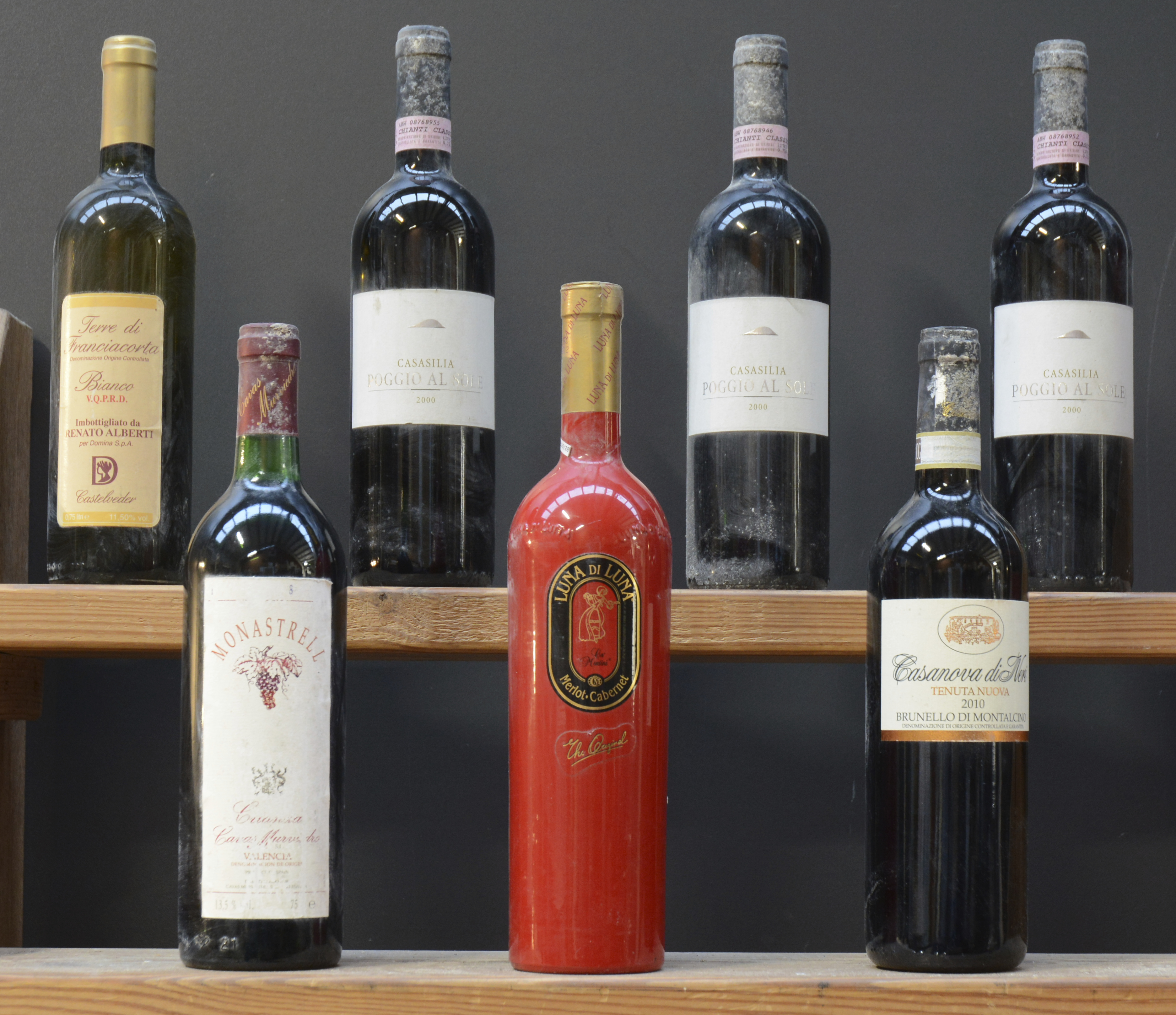 Lot wijn        aantal: 7 bt    Terre di Franciacorta Biancho D.O.C.  Renato Alberti, Castelveder M.O.  1998  aantal: 1 bt    Poggio al Sole Casasilia D.O.C.G. Chianti Classico   M.O.  2000  aantal: 3 bt    Tenuta Nuova D.O.C.G. Brunello di Montalcino  Casanova di Neri M.O.  2010  aantal: 1 bt    Luna di Luna Merlot-Cabernet I.G.T. delle Venezie  Ca’Montini, Calmasino M.O.  2001  aantal: 1 bt    Monastrell Crianza D.O. Valencia  Cavas Murviedro M.O.  2008  aantal: 1 bt
