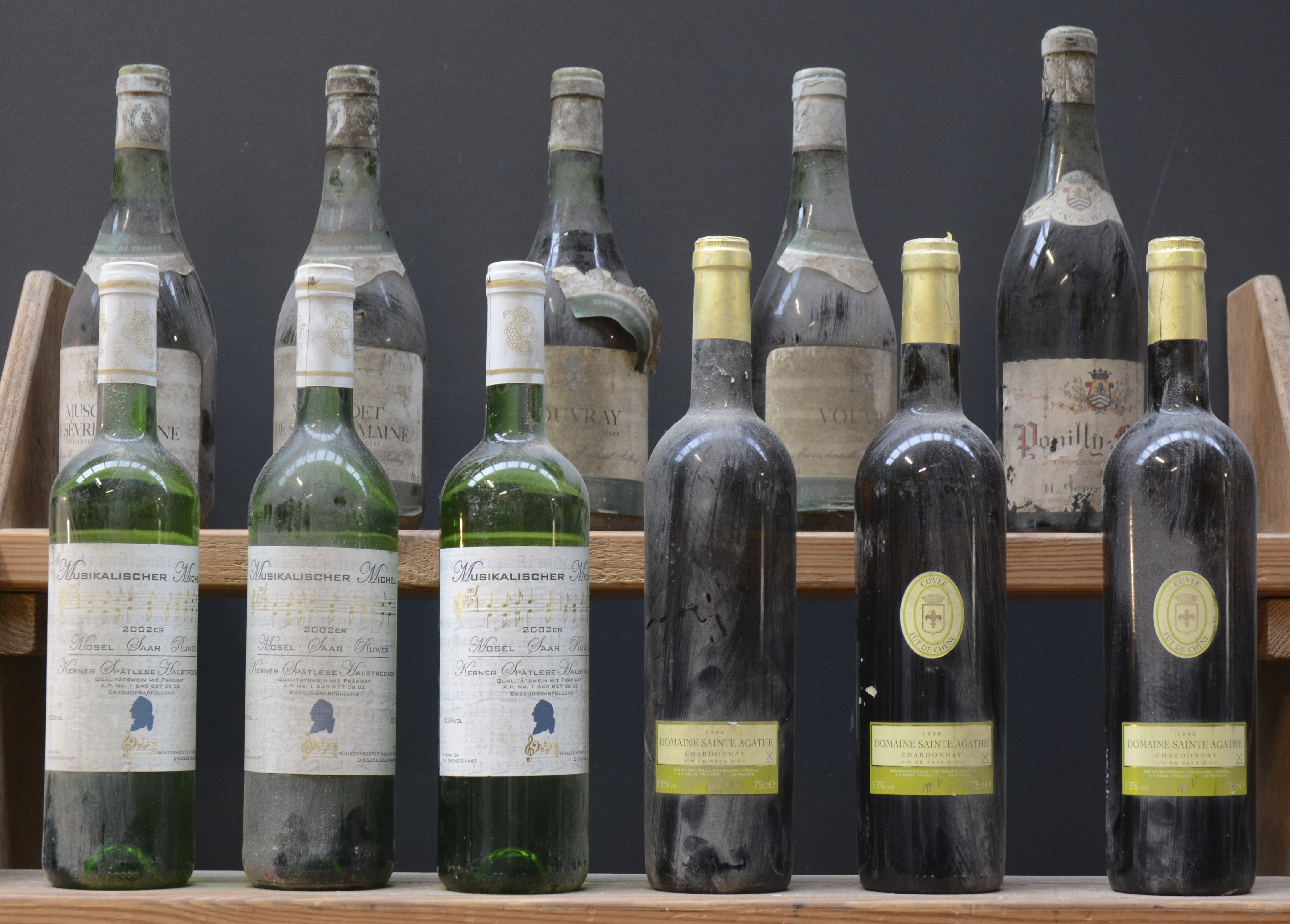 Lot witte wijn        aantal: 11 bt    Kerner Spätlese Halbtrocken Q.m.P. Mosel-Saar-Ruwer  Musikalischer Michel, Michael ERbes, Zell E.A.  2002  aantal: 3 bt    Chardonnay Vin de Pays d’Oc  Dom. Ste Agathe M.O.  1998  aantal: 3 bt    Muscadet de Sèvres et Maine A.C.   Montreuil M.O.  1975  aantal: 2 bt    Vouvray A.C.  Montreuil M.O.  1971  aantal: 2 bt    Pouilly-Fuissé V.S.R. A.C.   M.O.    aantal: 1 bt