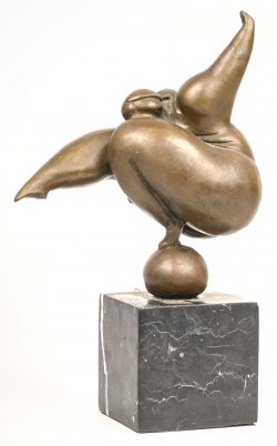 A bronze statue of a voluptuous dancing woman on a ball, with marble base, signed Milo. -