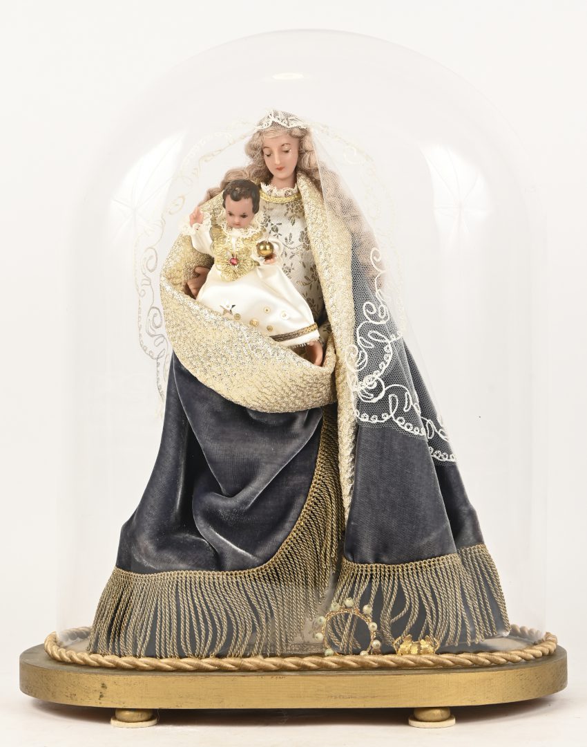 The Holy Family, a multicolored porcelain sculpture under glass dome. -