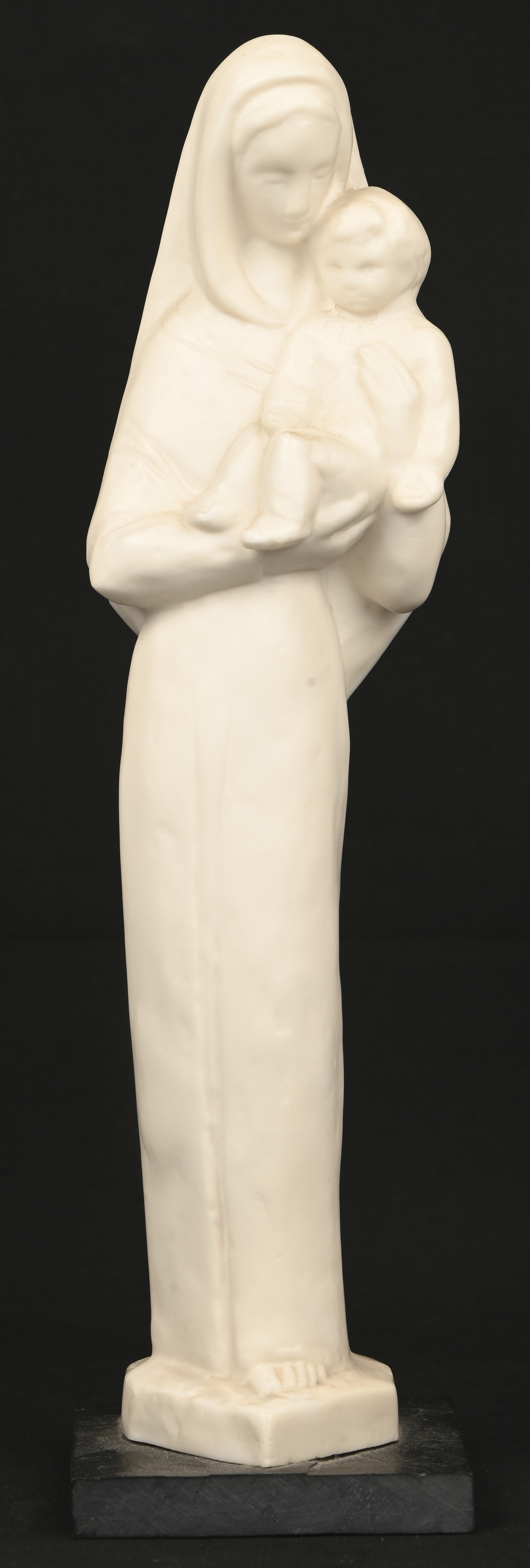 #246Een ovaal glazen stolp op houten sokkel met wassen Mariabeeld.