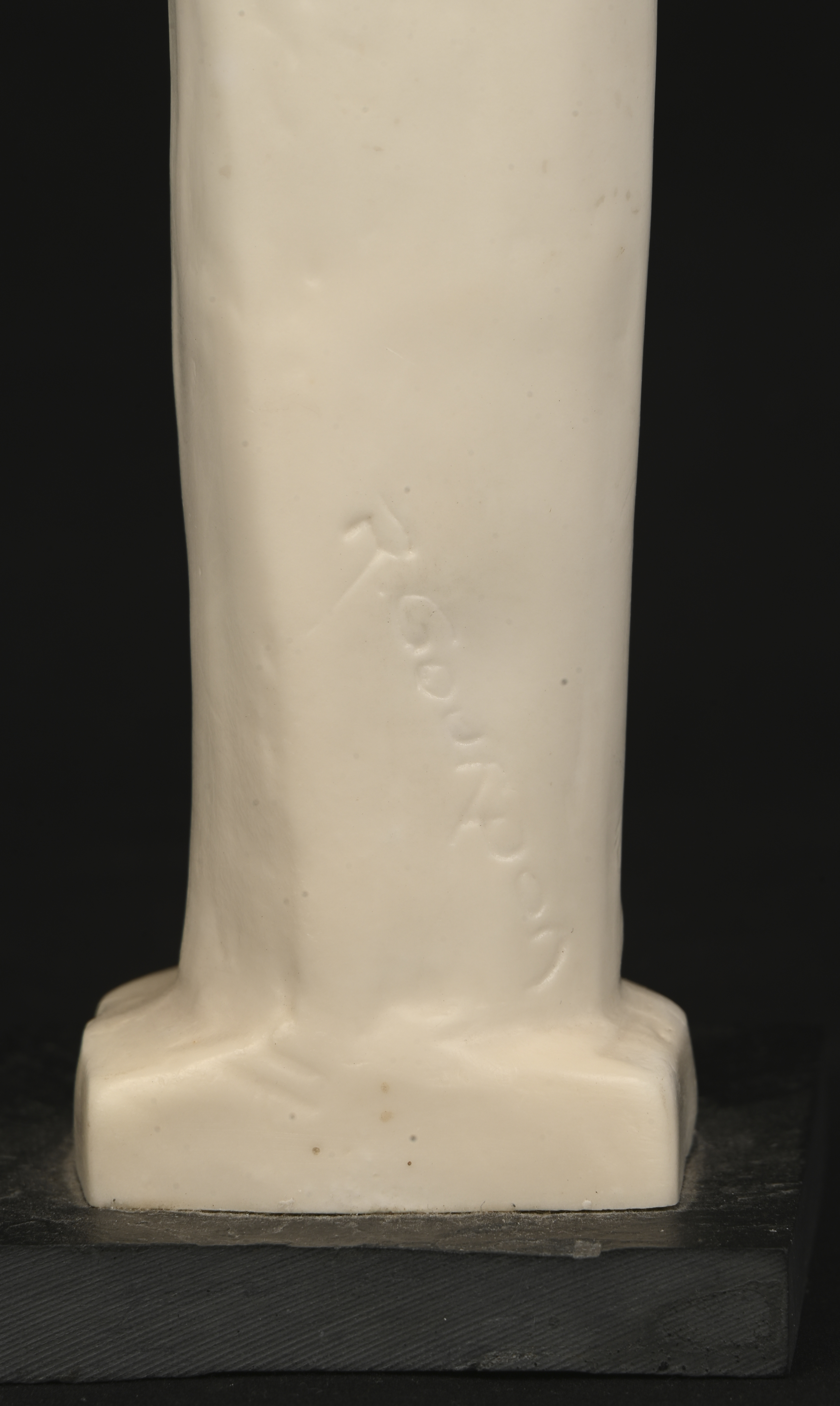 #26‘Vrouwenportret met pluimentooi’, een geglazuurd aardewerken beeldje op metalen voet.