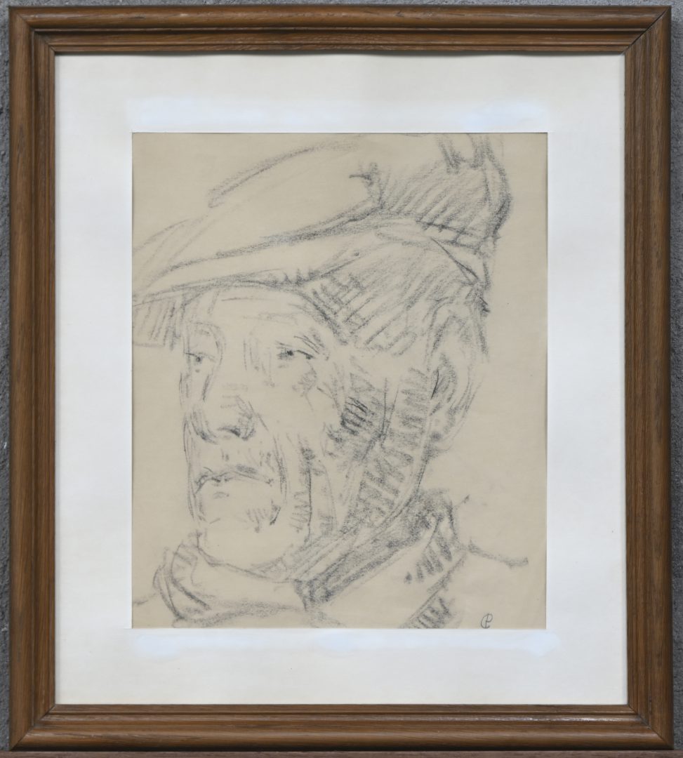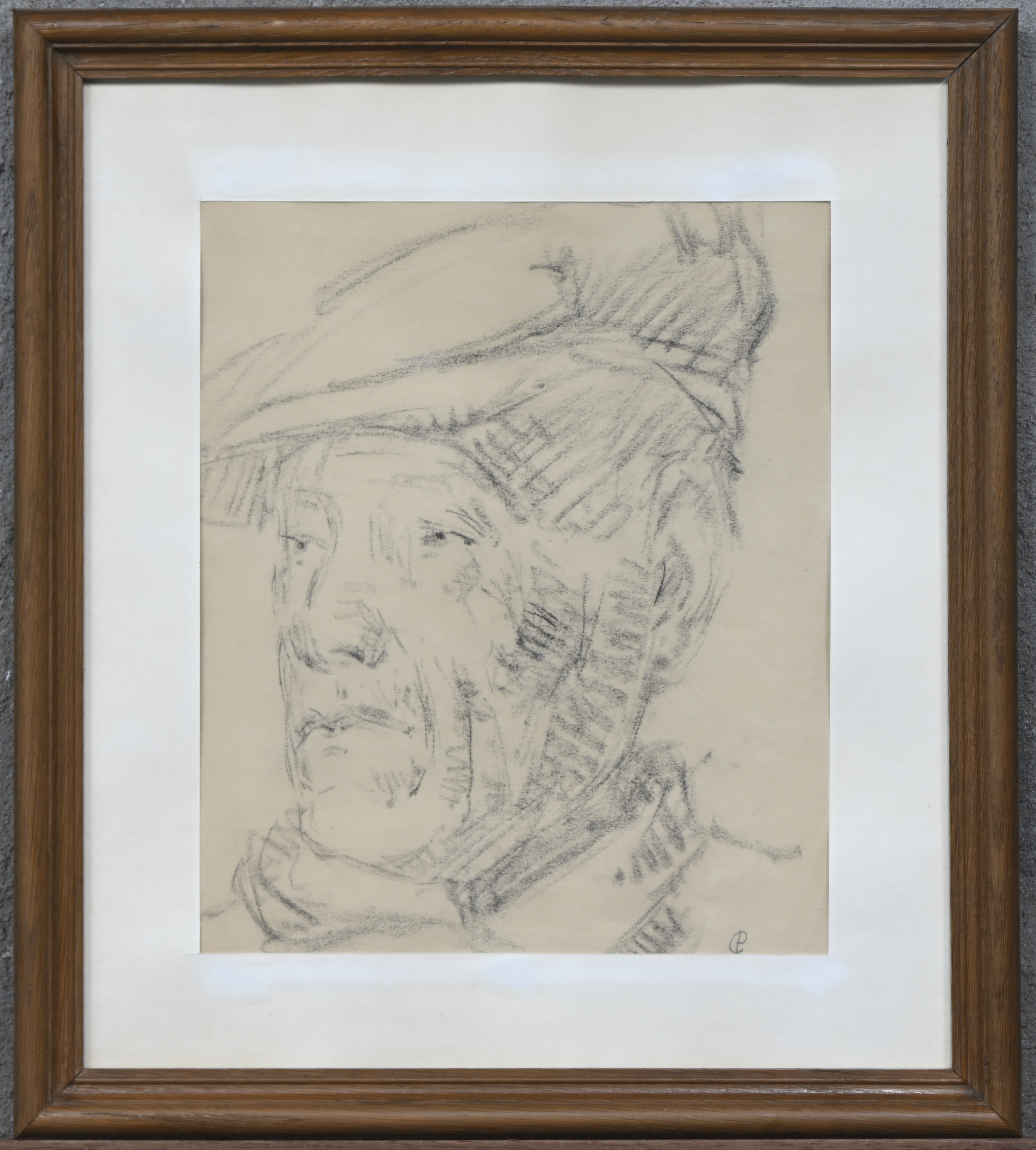 “Man with cap,” a charcoal drawing. Monogrammed CP.