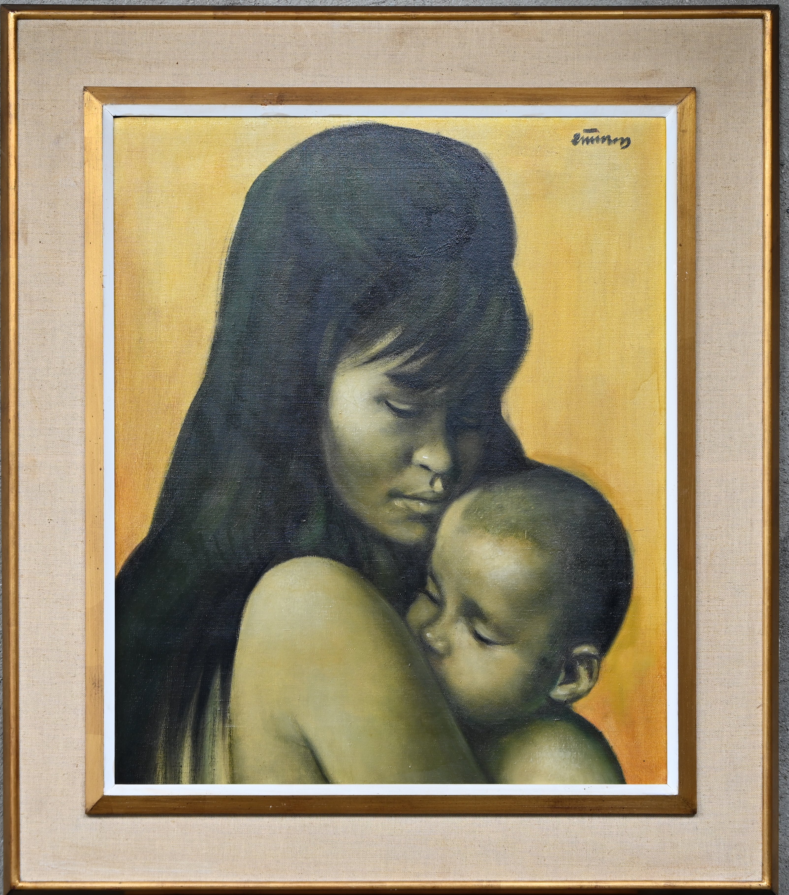 #374Edgard HeirmanPeriod: 1919-2002‘Geborgenheid’, olieverf op doek. Getekend E. Heirman.