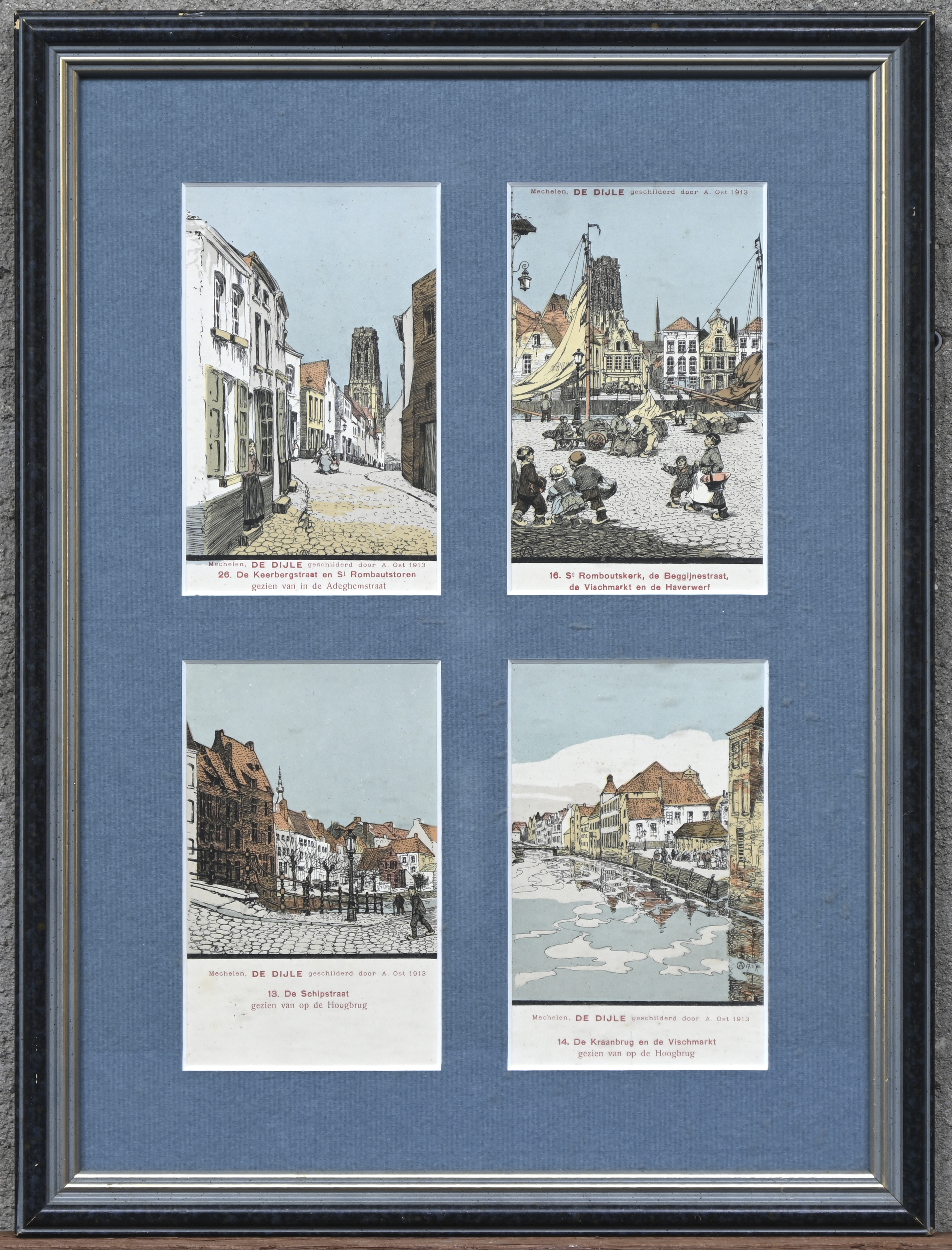 ‘Mechelen De Dijle’, vier kaarten naar het werk van Alfred Ost. Ingekleurde litho’s.