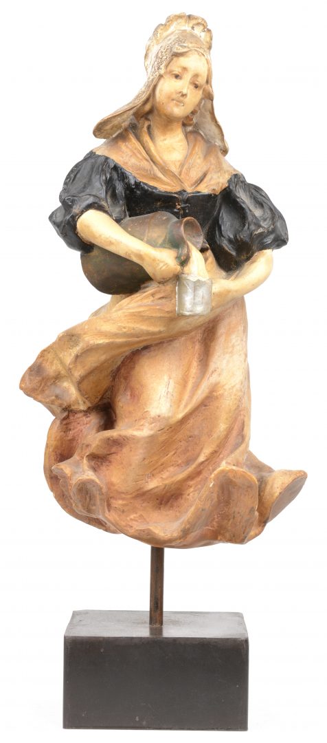 A plastic sculpture of a greeting nobleman on a wooden base. Damage to the left arm/sleeve. -