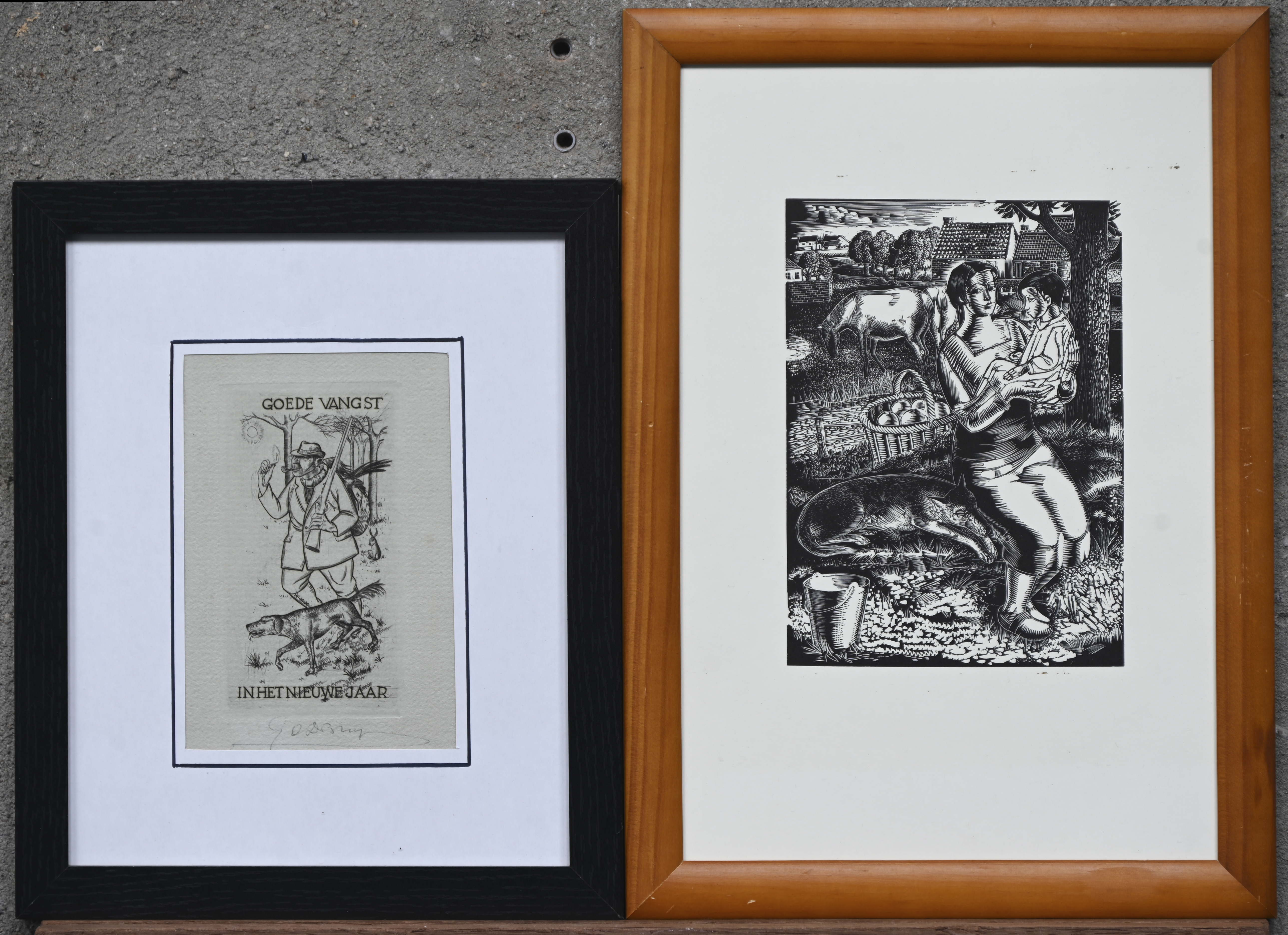 “Melkmeisje en Goede vangst in het nieuwe jaar”, twee gravures van Gustaaf De Bruyne, 1 buiten de plaat gesigneerd.