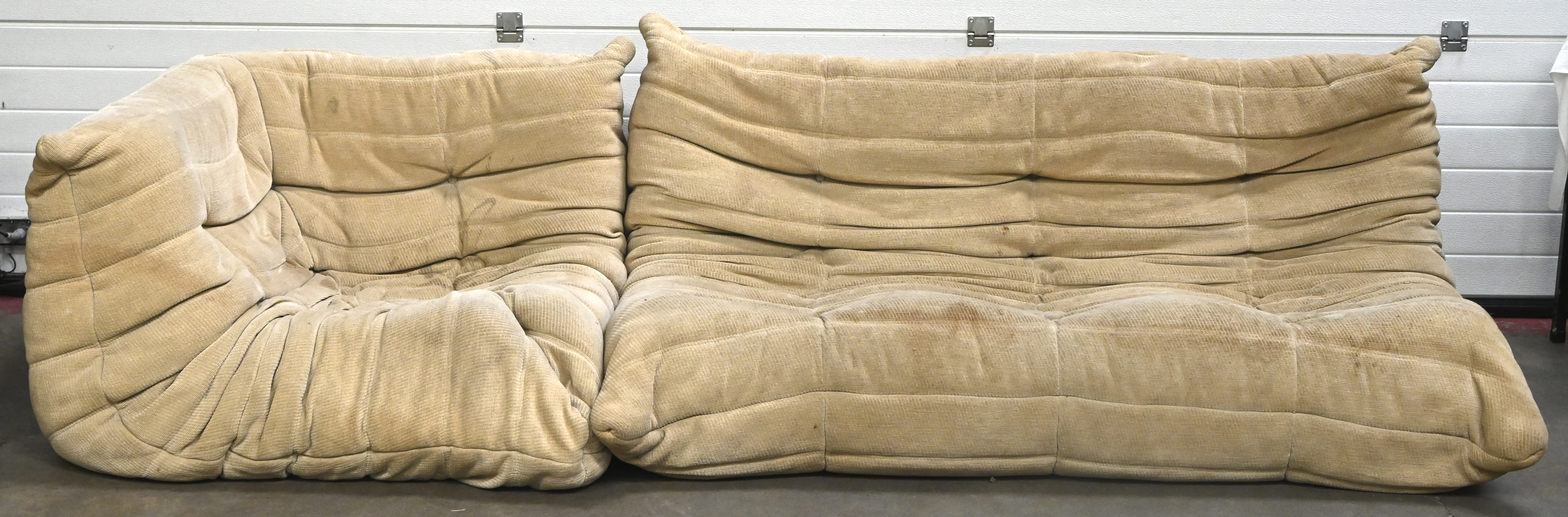 Michel Ducaroy voor Ligne Roset, driezit en hoeksofa, model Togo. Lichtbruin velours bekleding, op te frissen.