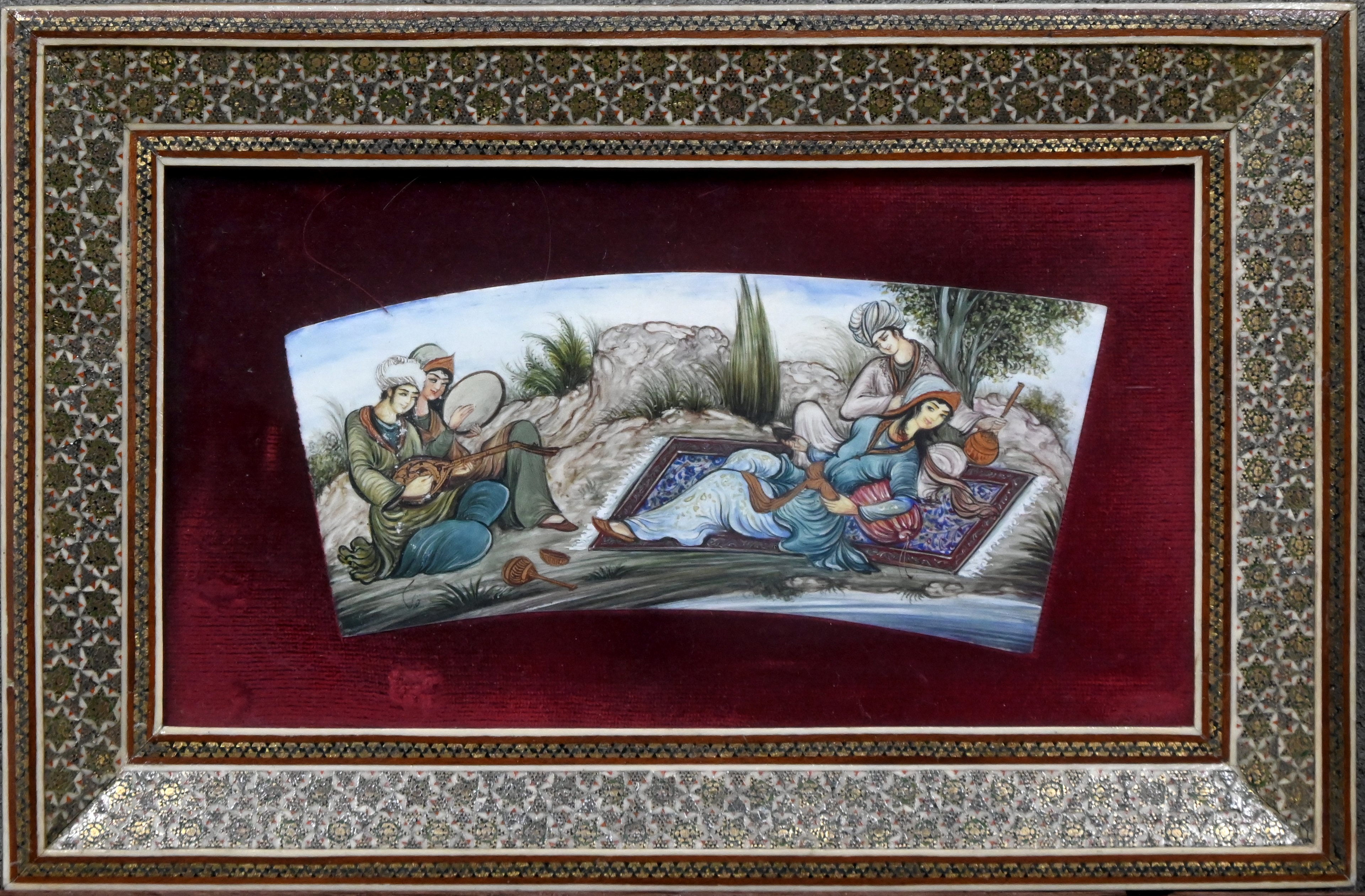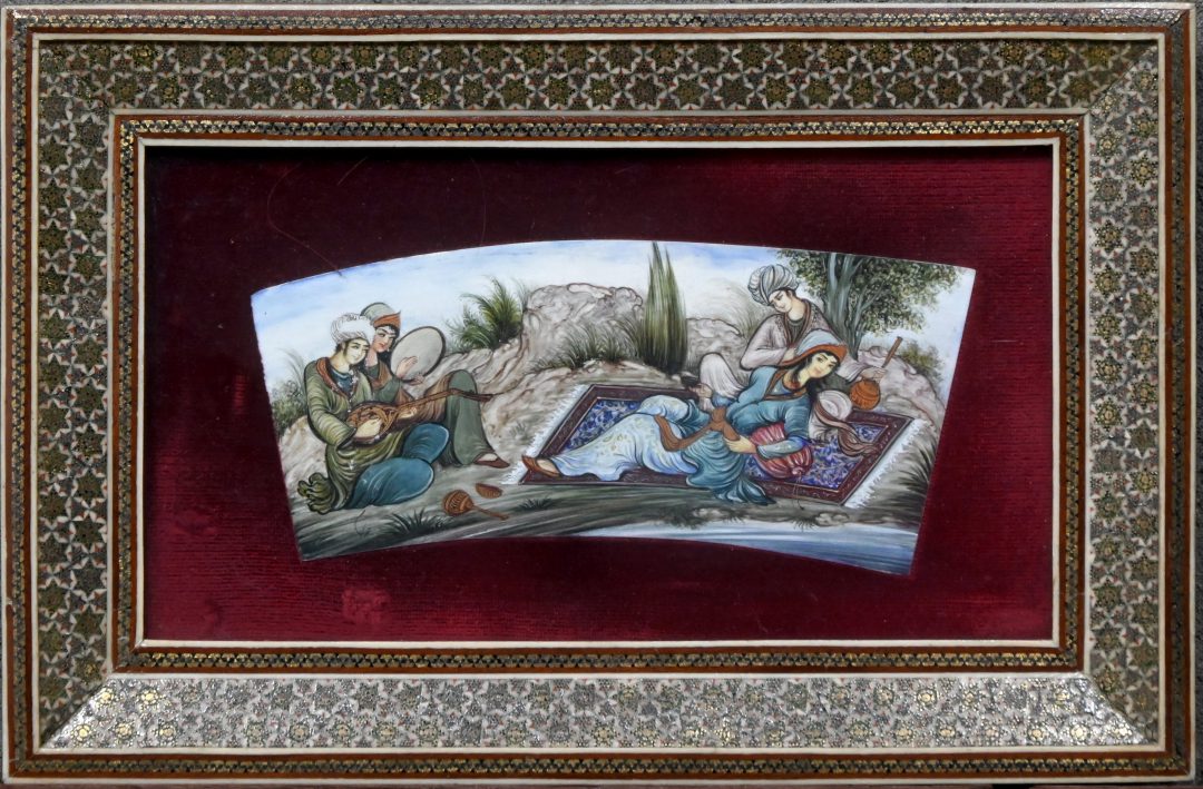 Miniatuur met rustende en musicerende Oosterse personages. Pastel op paneel.