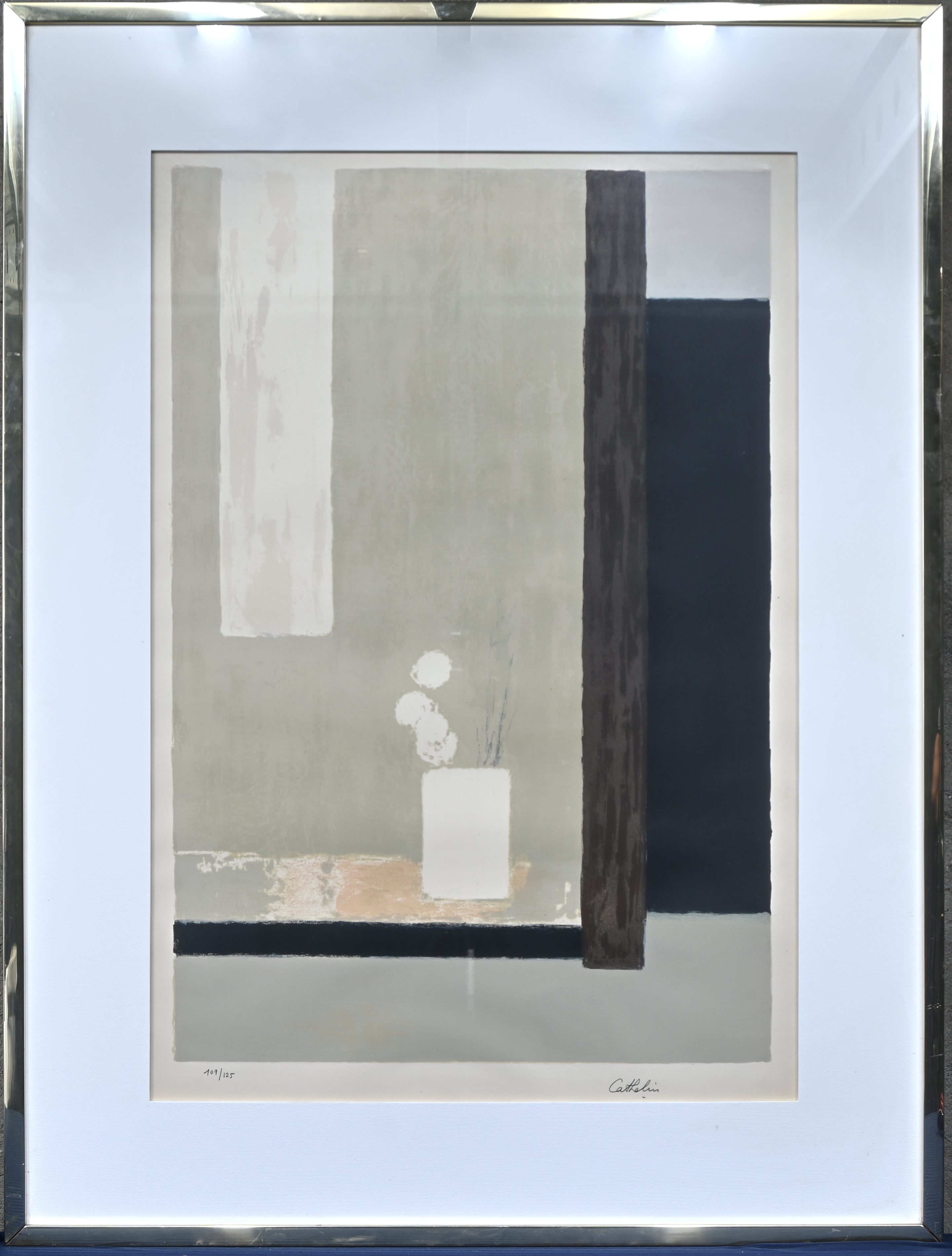 #572Paul De VreePeriod: 1909 - 1982“Hommage to Luciano Fontana”, een zeefdruk op papier, gesigneerd, genummerd en getiteld in potlood Paul De Vree, 109/120. Waterschade.