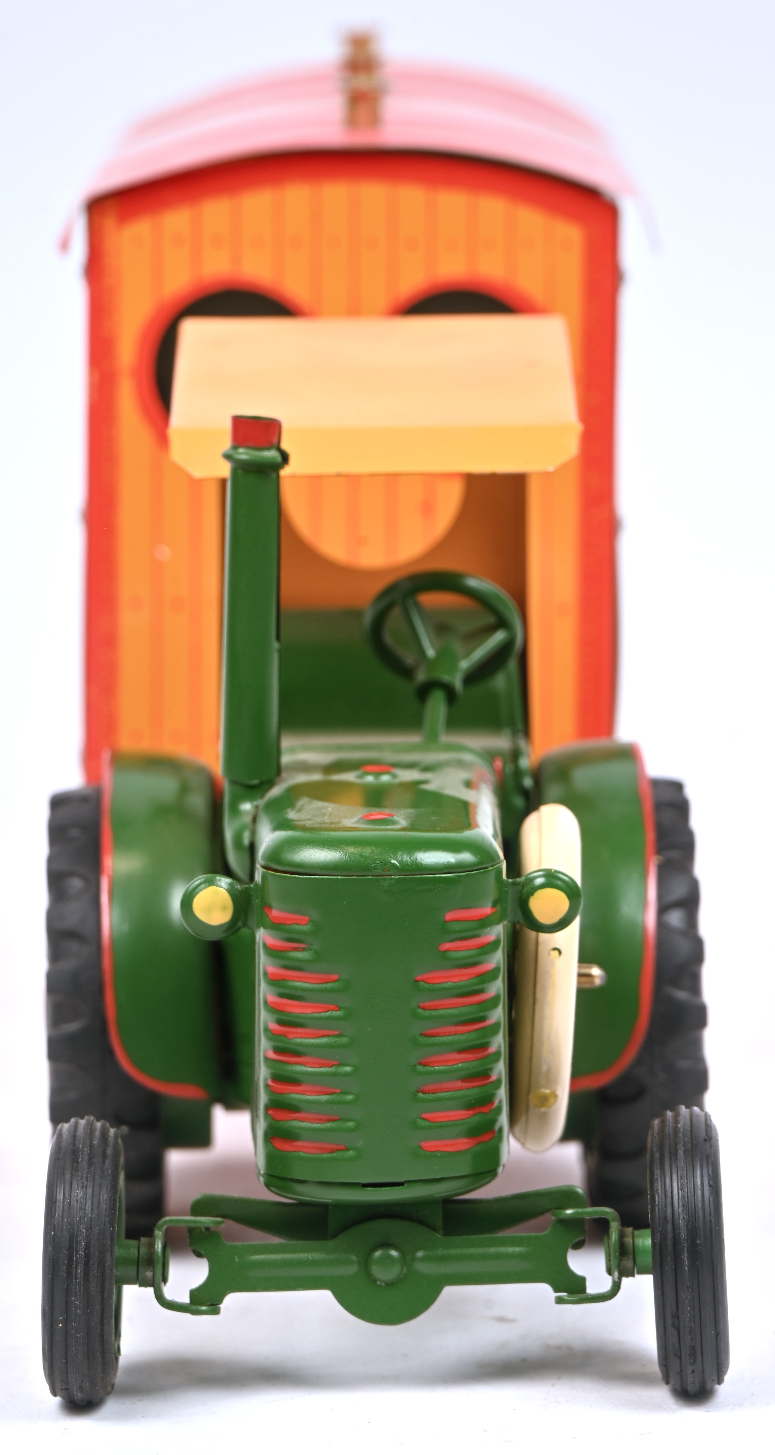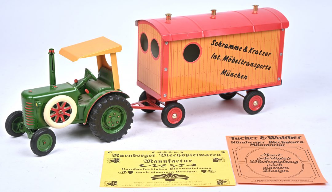 #27Nürnberger Bleichwaren Tucher & Walter‘Landwirtschaftsfahrzeug’, een blikken tractor met aanhanger. Model T-178, nr 29 uit een oplage van 500 exemplaren. Met OVP.
