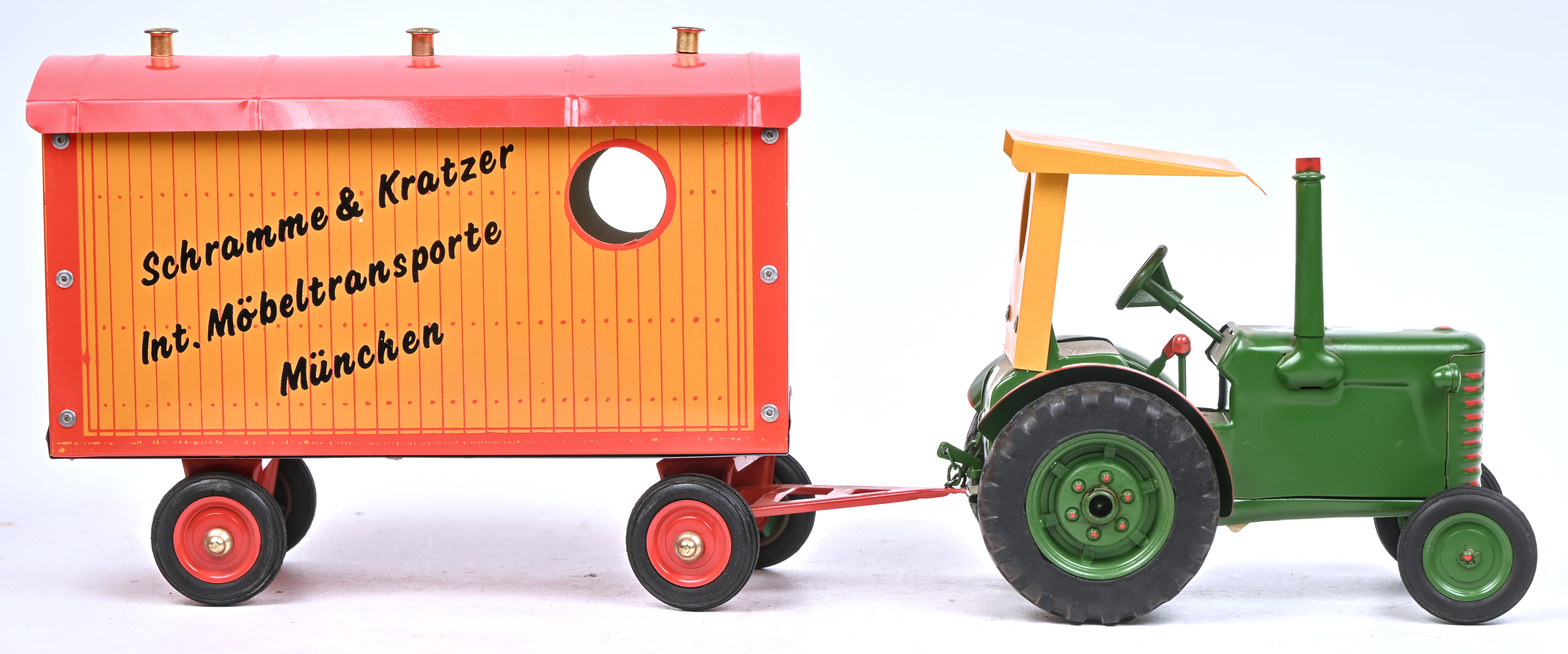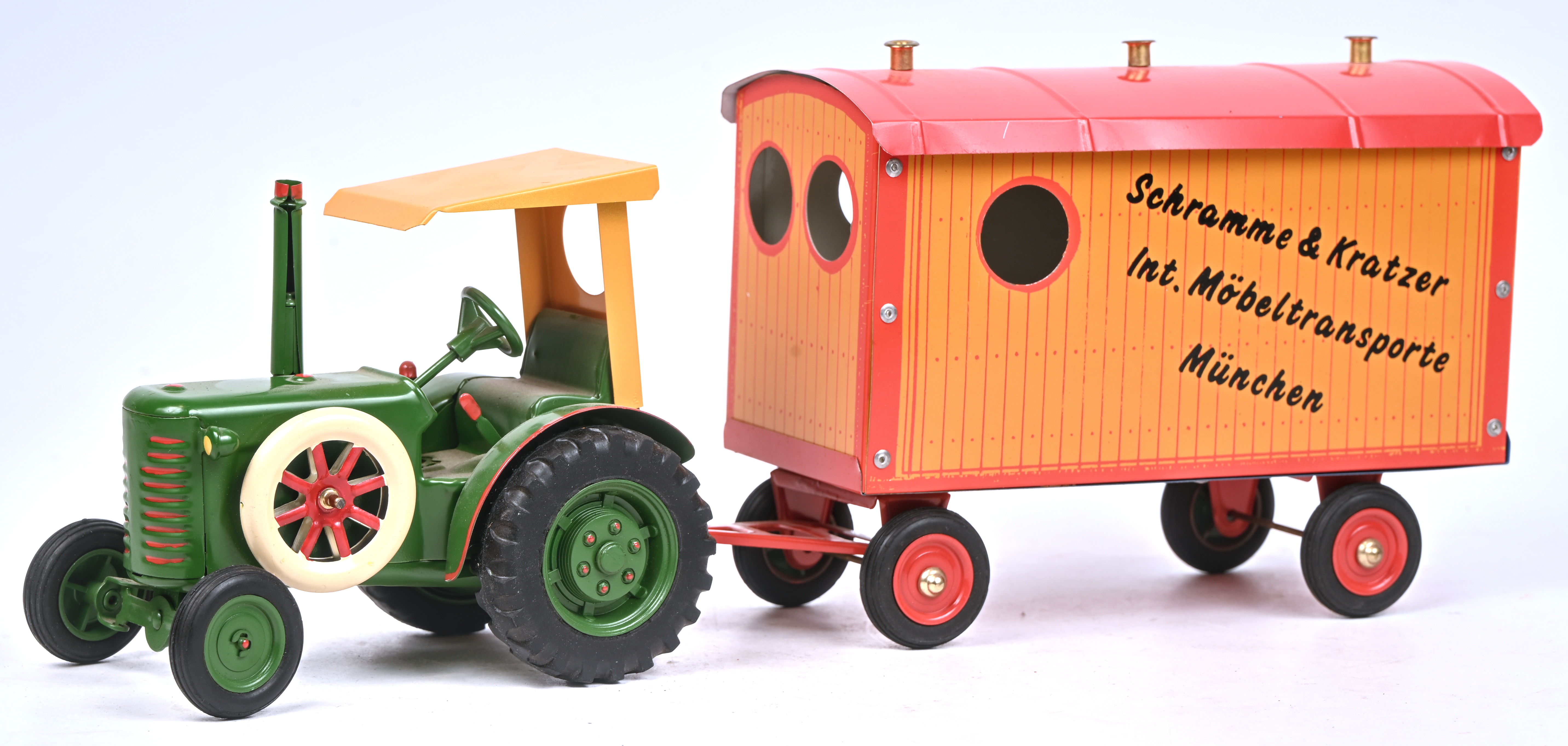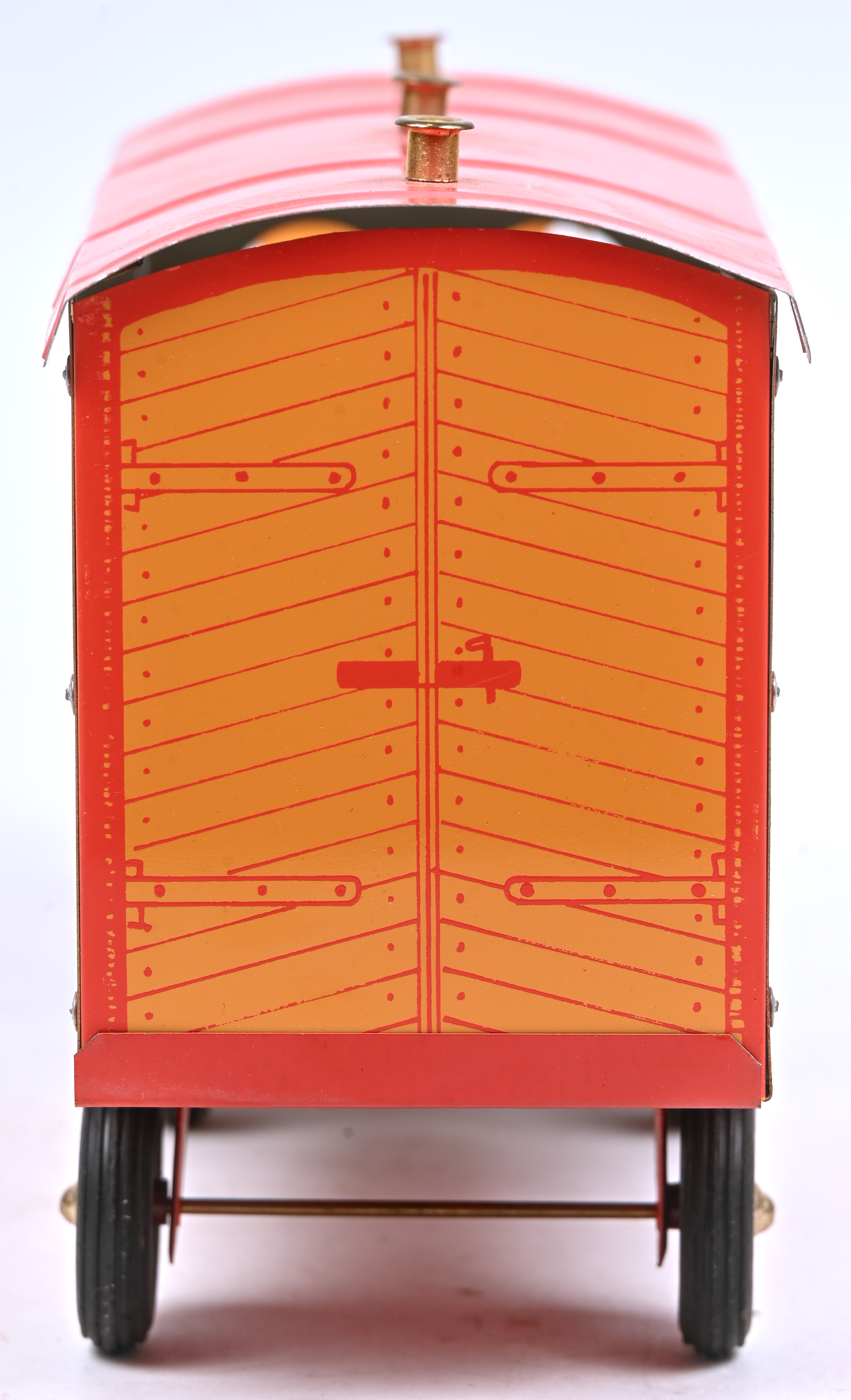 ‘Ziskuswagen’, a tinplate gypsy wagon with ‘Circus Renz’ inscription. Model T-176, number 35 out of 400. With original packaging. Also includes a tinplate tractor from set T-175. -