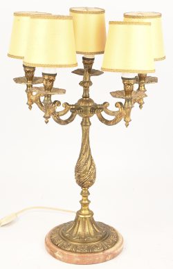 #237Een messing tafellamp in de vorm van een vijfarmige kandelaar. Met lampenkapjes.
