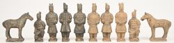 #558Een lot van 10 terracotte beeldjes naar de Tang dynastie bestaande uit 2 paarden en 8 soldaten.
