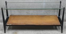 #366Een vintage salontafeltje met glazen blad. Design 1960. Gebruikssporen.