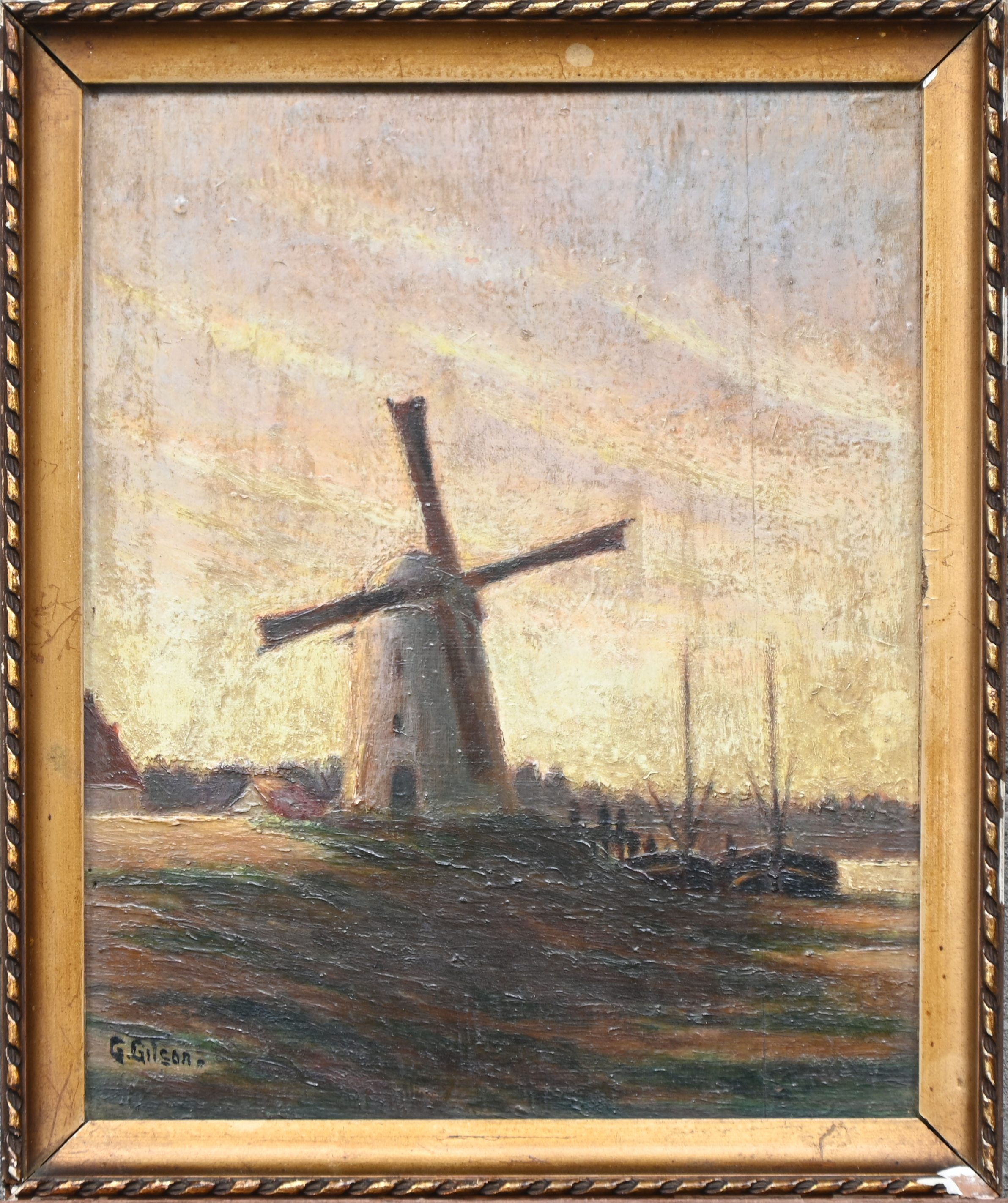 "Molenzicht", a painting, oil on panel, signed G. Gilson.