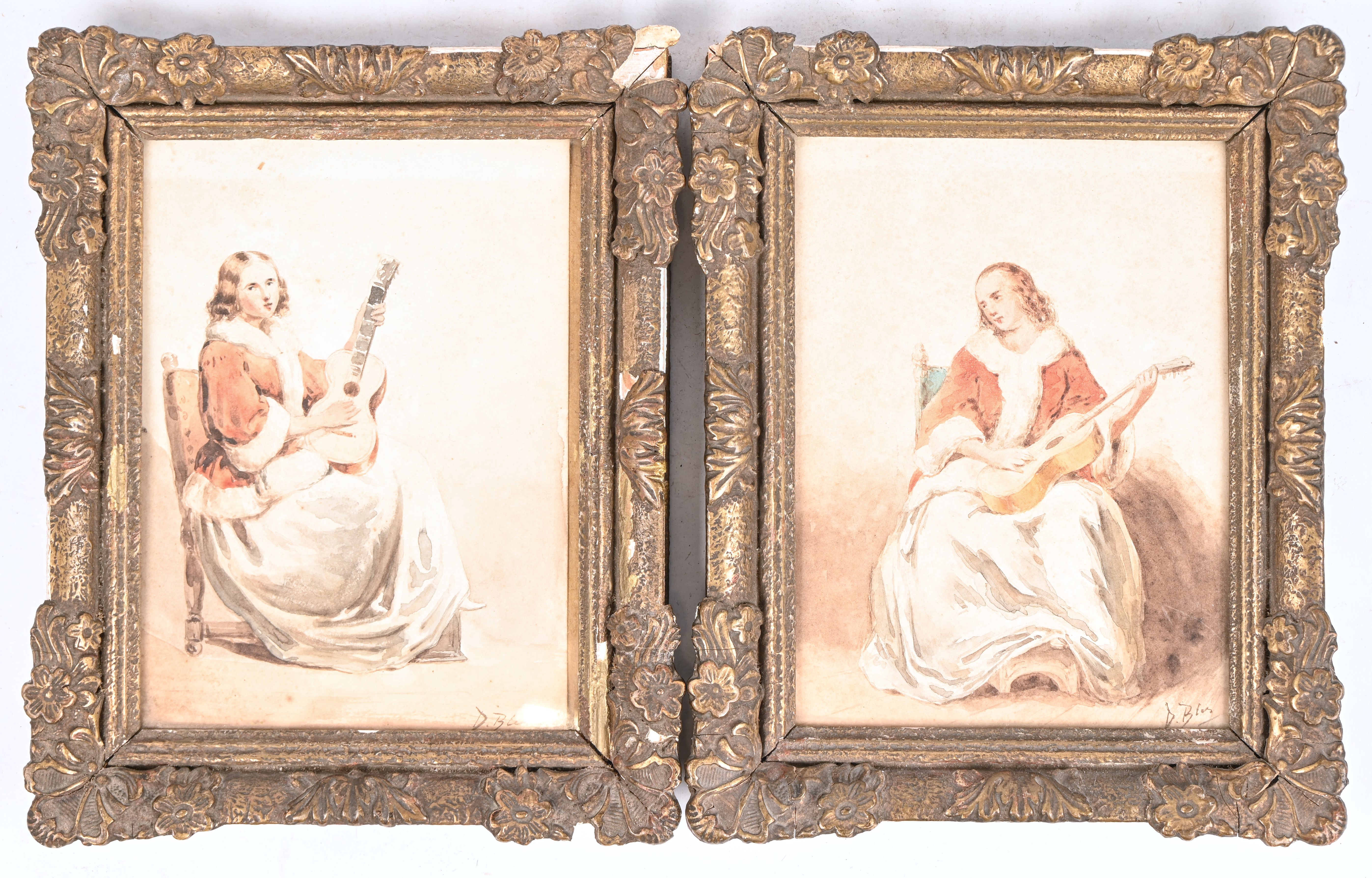 ‘musicerende jonge vrouwen’, twee aquarellen getekend D. Bles.
