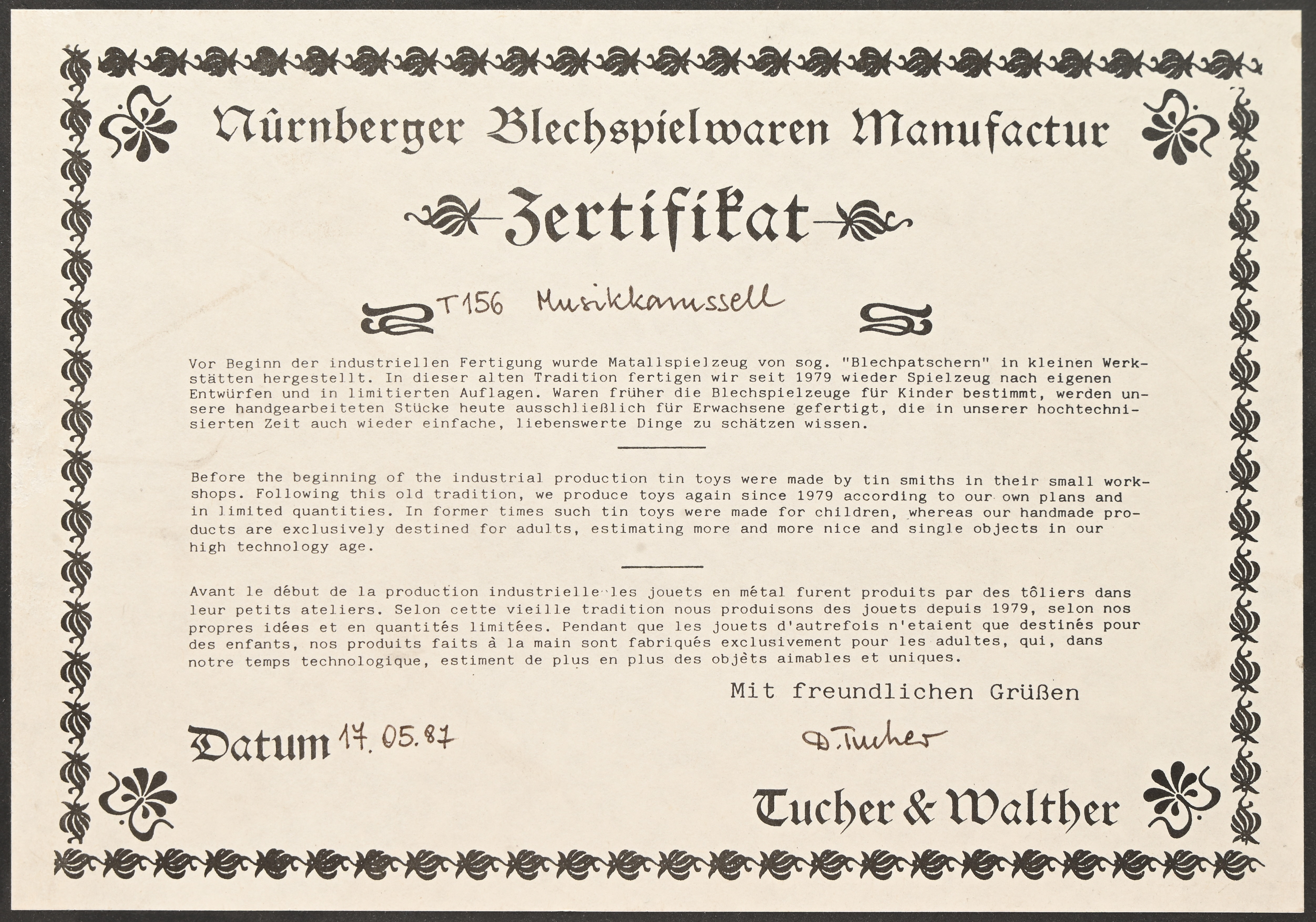 #11Nürnberger Bleichwaren Tucher & WalterPeriod: 1986‘Pferdekarussell mit Musik’, een blikken paardemolen. Top van de centrale as en vlag zijn manco. Model T-162, uitgegeven in een beperkte oplage van 200 exemplaren. Met OVP.