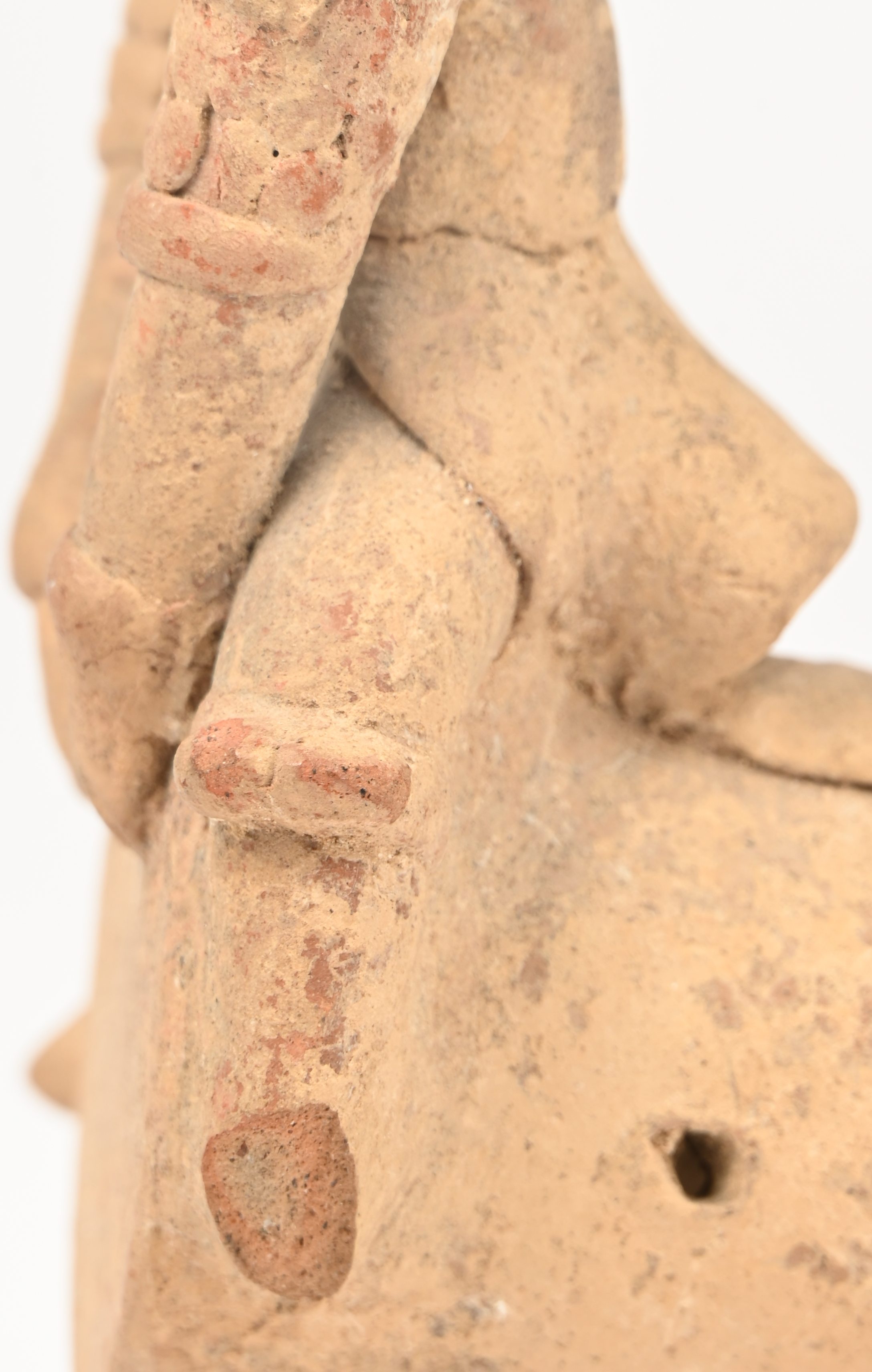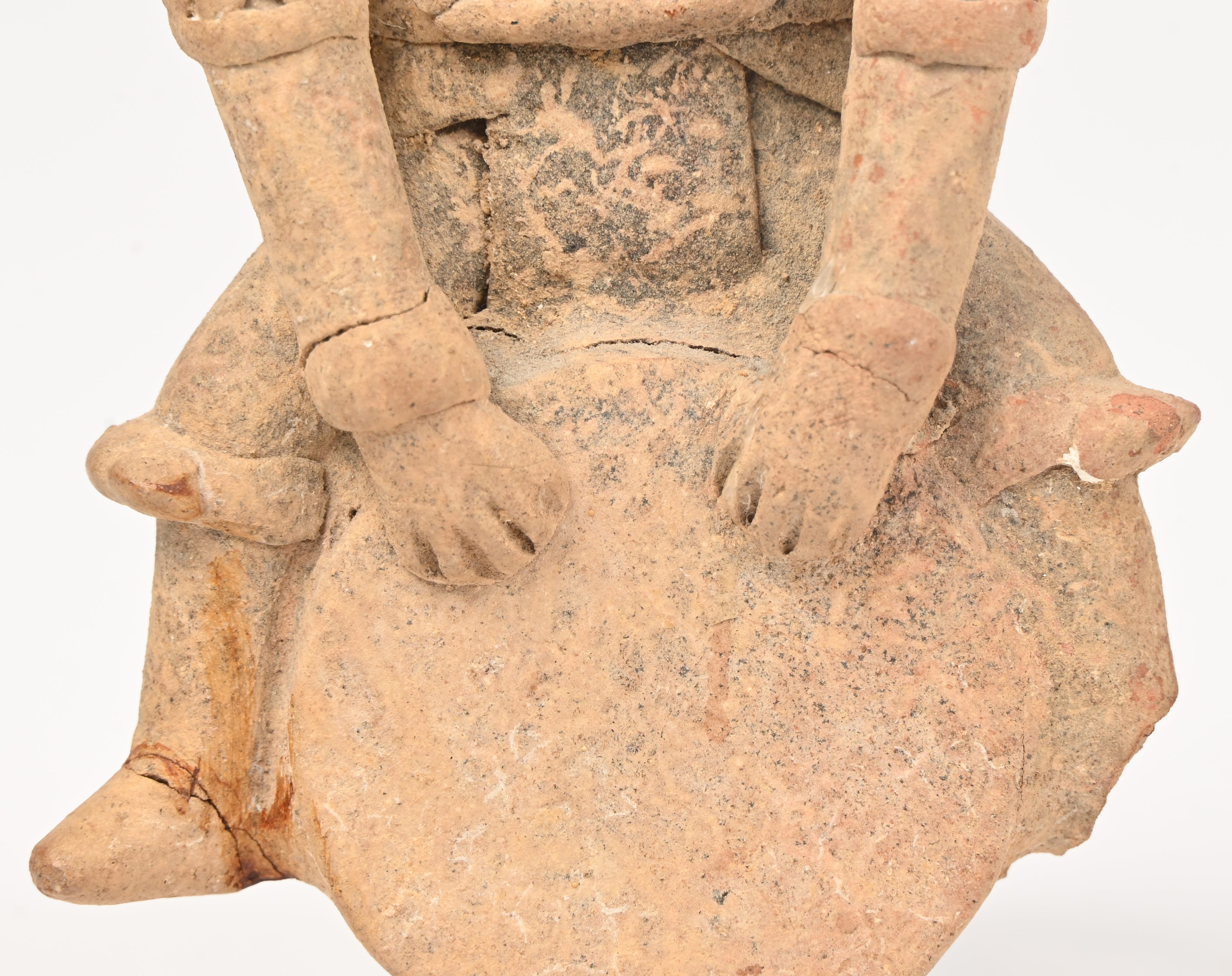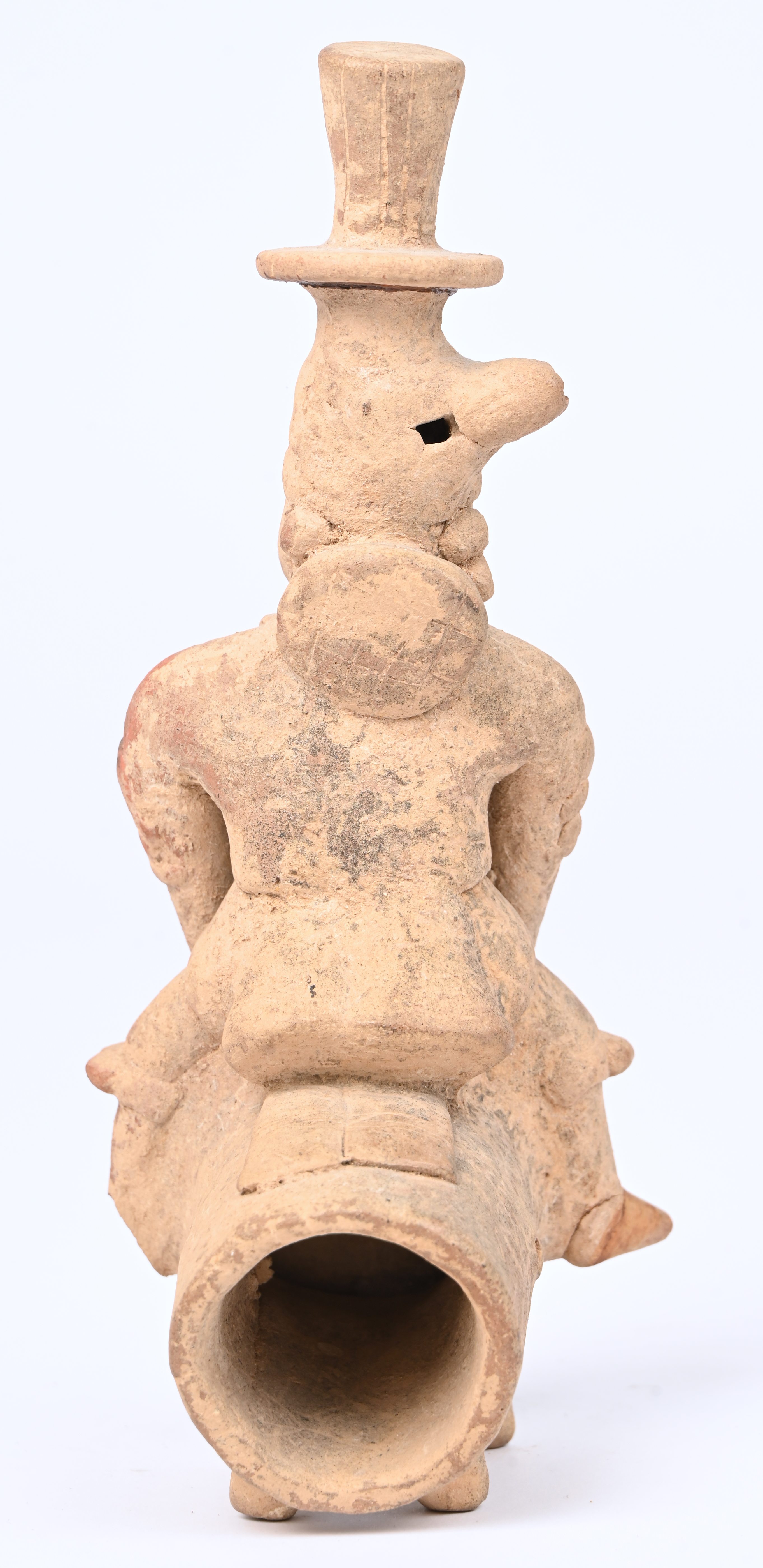 ‘Muzikant met hoge hoed, gezeten op een trommel’. Een aardewerken beeldje in precolumbiaanse stijl. De hoed en één voet zijn gelijmd, één voet is manco.