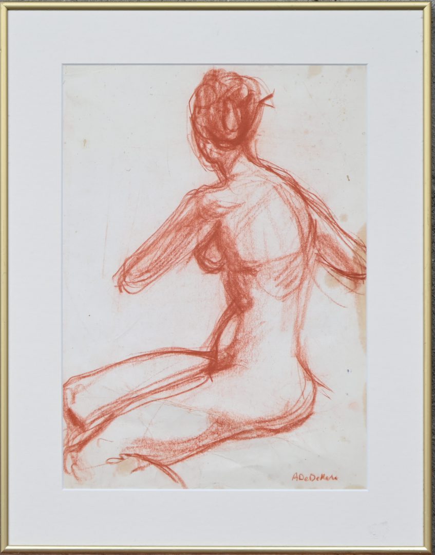 Naaktstudie in rood krijt. Getekend A. De Deken.