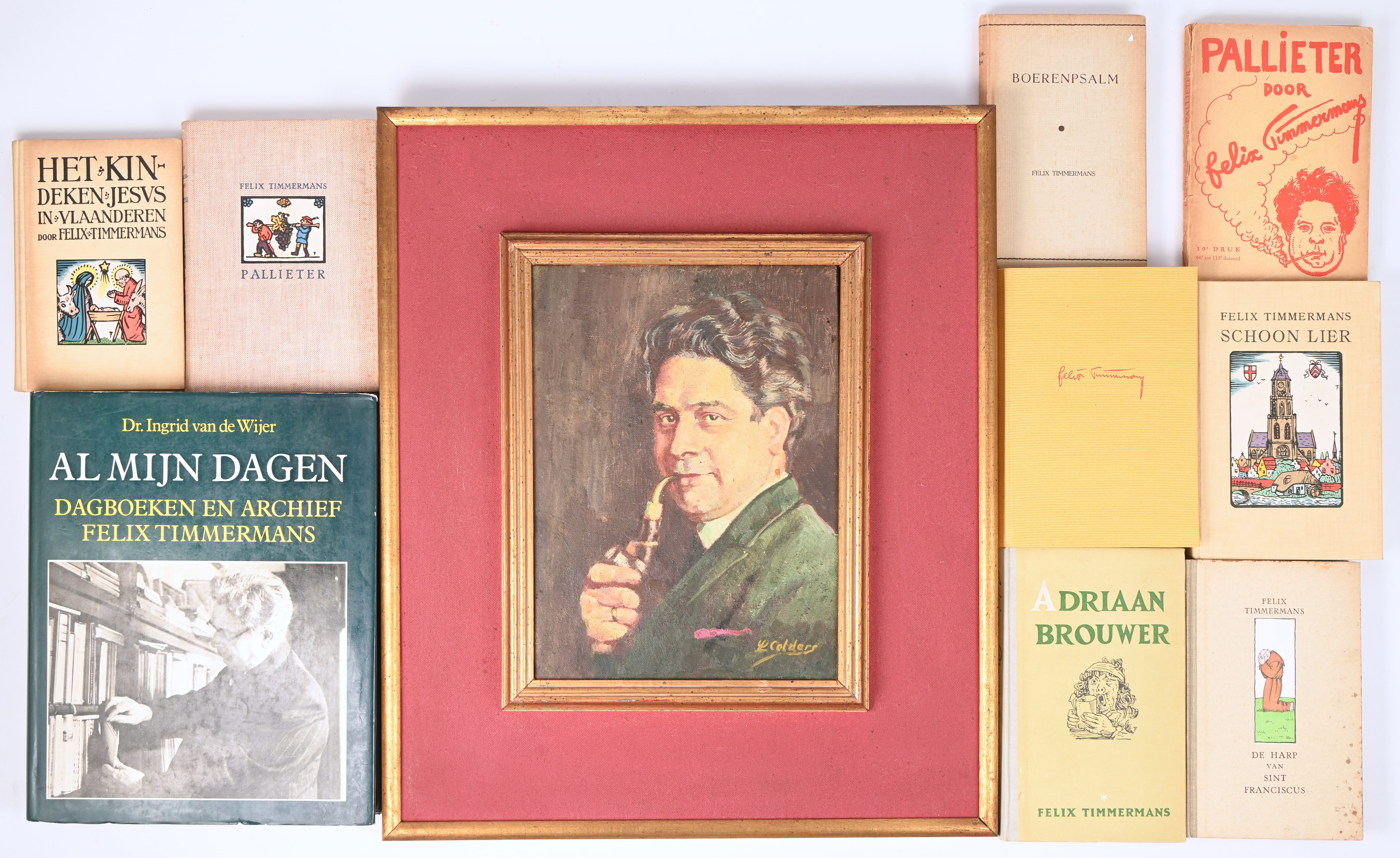 Negen boeken door Felix Timmermans waaronder ‘Pallieter’, ‘Boerenpsalm’, ‘Het kindeken jezus’, ‘Adriaan Brouwer’ en andere. Toegevoegd een portret van Felix Timmerlmans, getekend Colders.