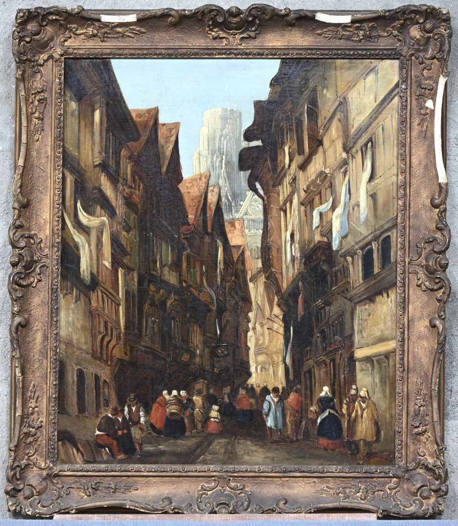 "Veere," a painting, oil on panel, signed by L. Van Engelen. -