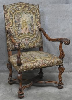 #256Een notenhouten armstoel met naaldwerk bekleed, met decor van een hofdame.