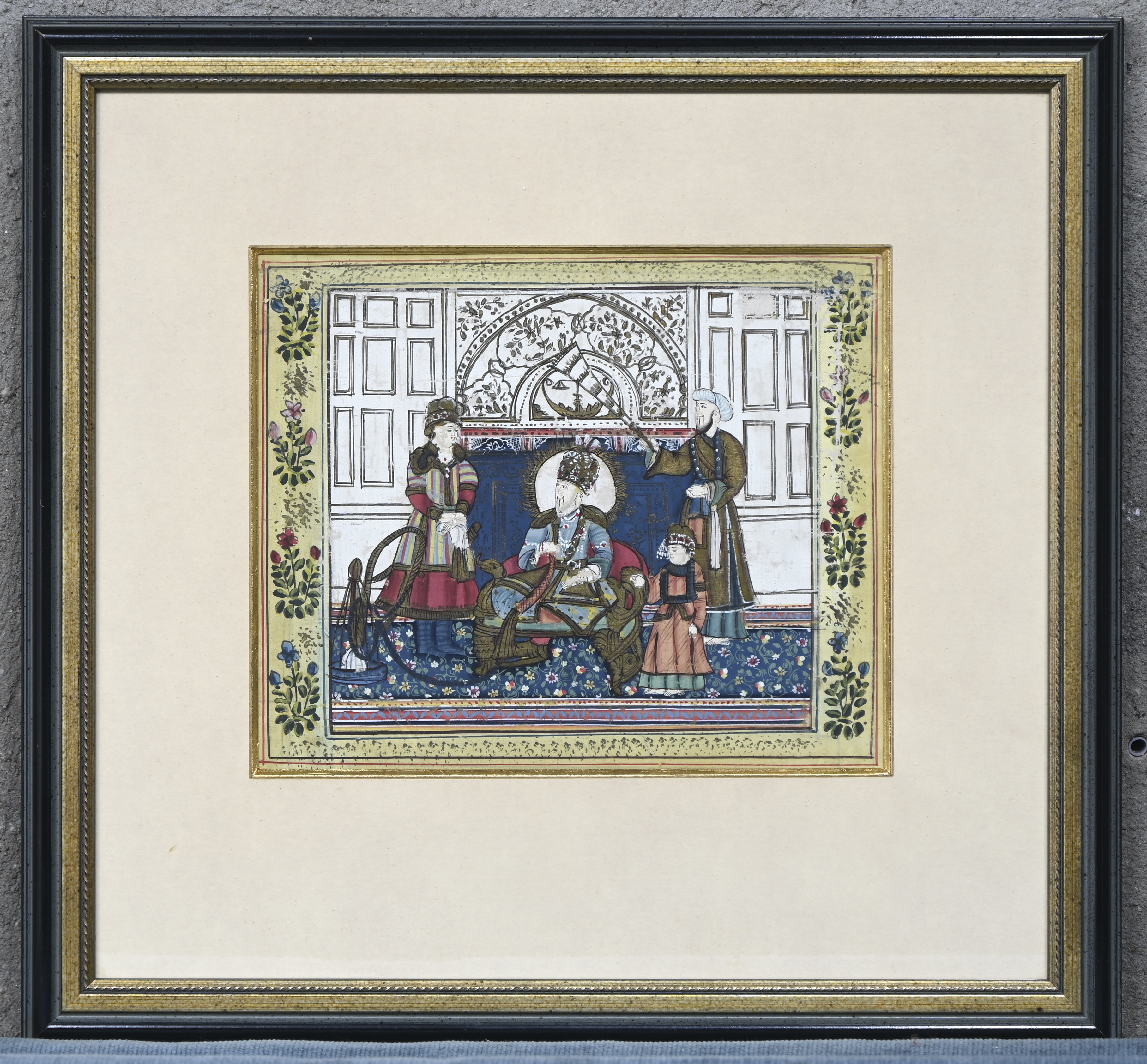 #256“De lezende Sultan”, een schilderij, op zijde, in passe-partout. Afkomstig uit India.