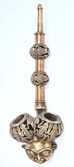 A bronze or brass double ceremonial pipe decorated with openwork insect motifs and a male head at the bottom. From Cameroon. -
