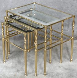 #216Een set van 3 bijzettafeltjes, messing en glas, in Hollywood Regency-stijl.