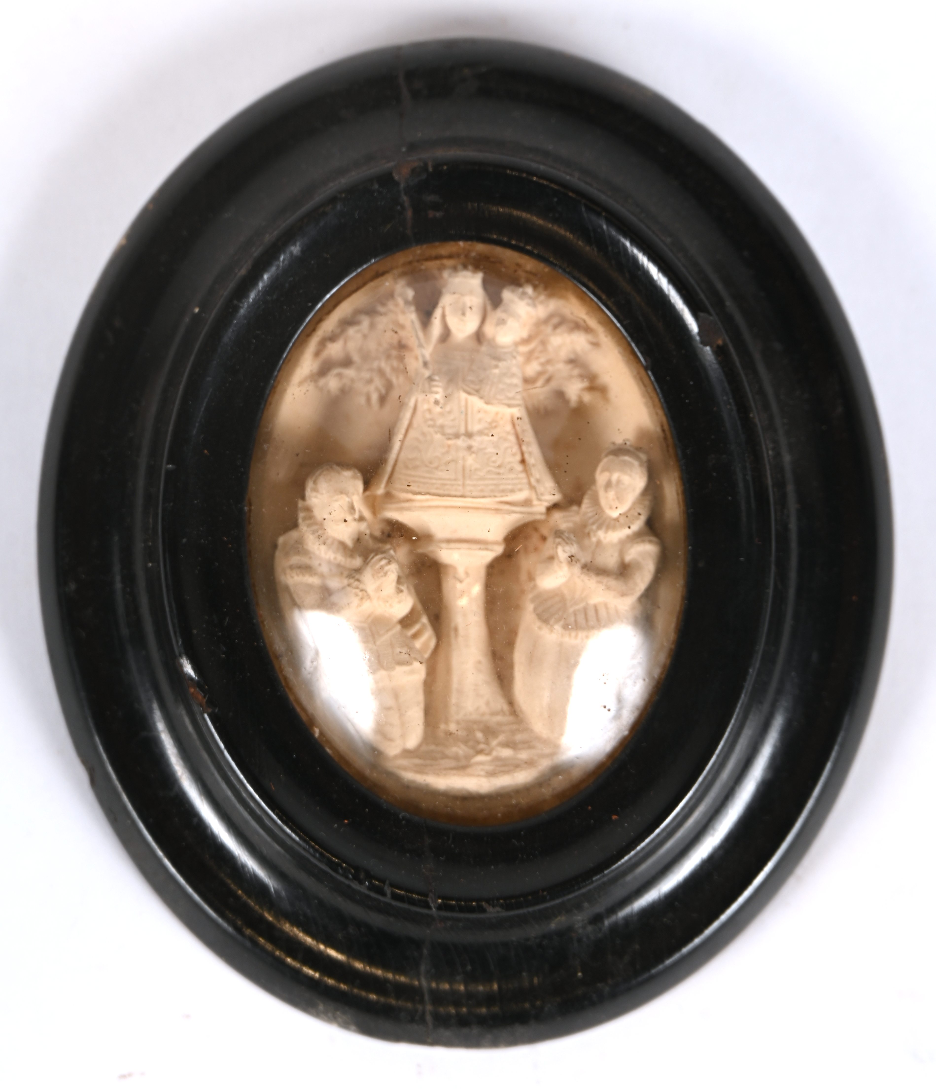 Oval pilgrimage souvenir in frame. Pipe clay.