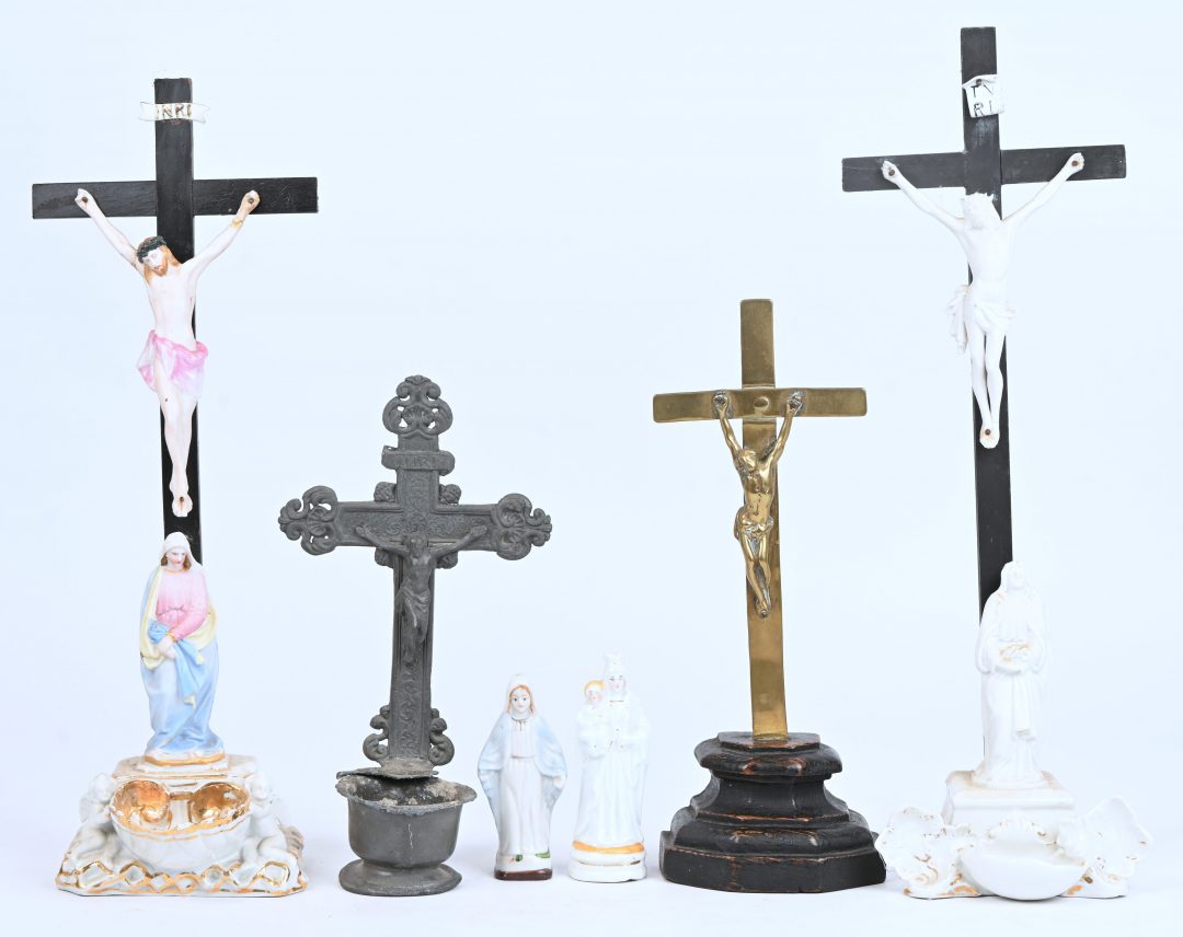 overwegend XIXde eeuw.Een lot van 3 wijwatervaten met kruisbeeld, een koperen kruisbeeld, biscuit, porselein en hout, en toegevoegd 2 kleine beeldjes,