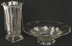 A lot of two cast colorless crystal objects, a bowl with grapevines, and an Art Deco style vase.