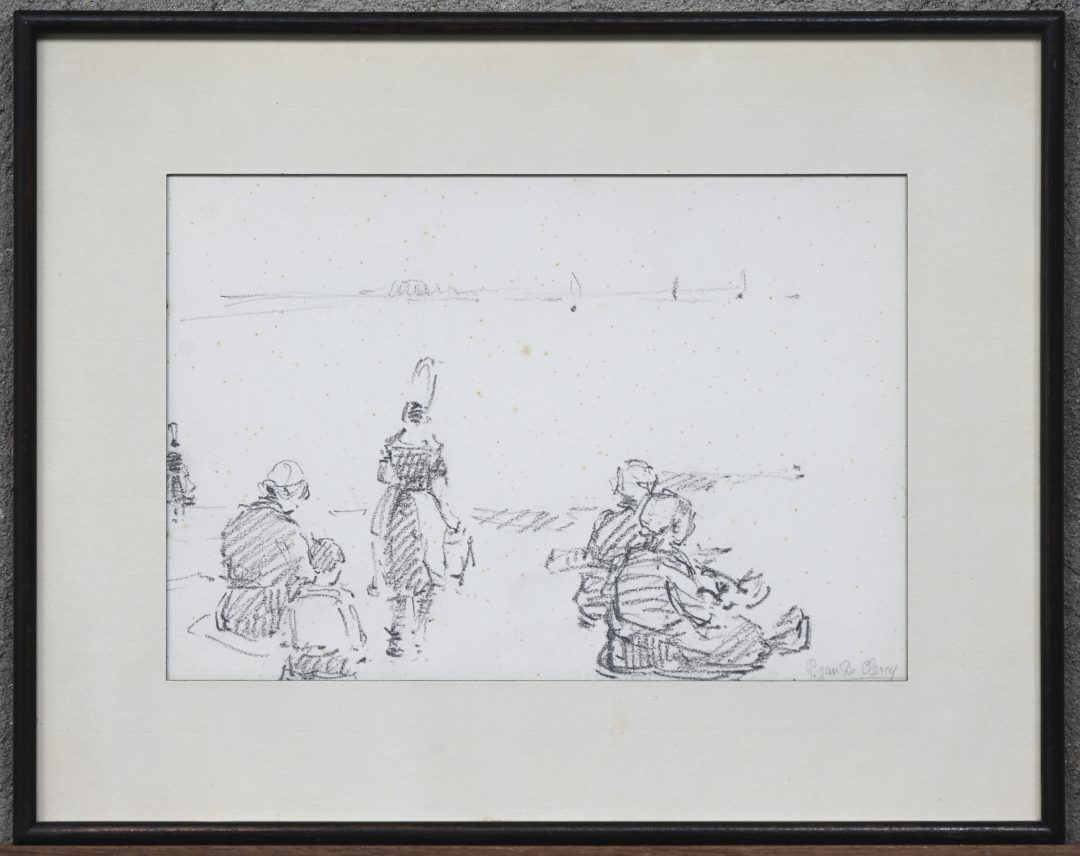 ‘Personages aan de waterkant’, een potloodstudie. Getekend P. Jan De Clercq.