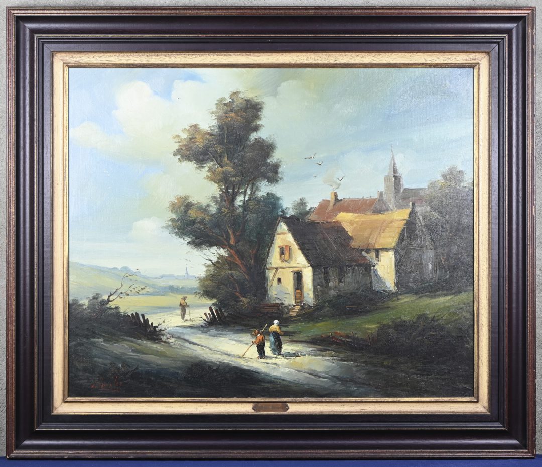 ‘Straatbeeld met torentje’, olieverf op doek. Getekend; De Moen. Impressionistisch werk in gedempte tonen.
