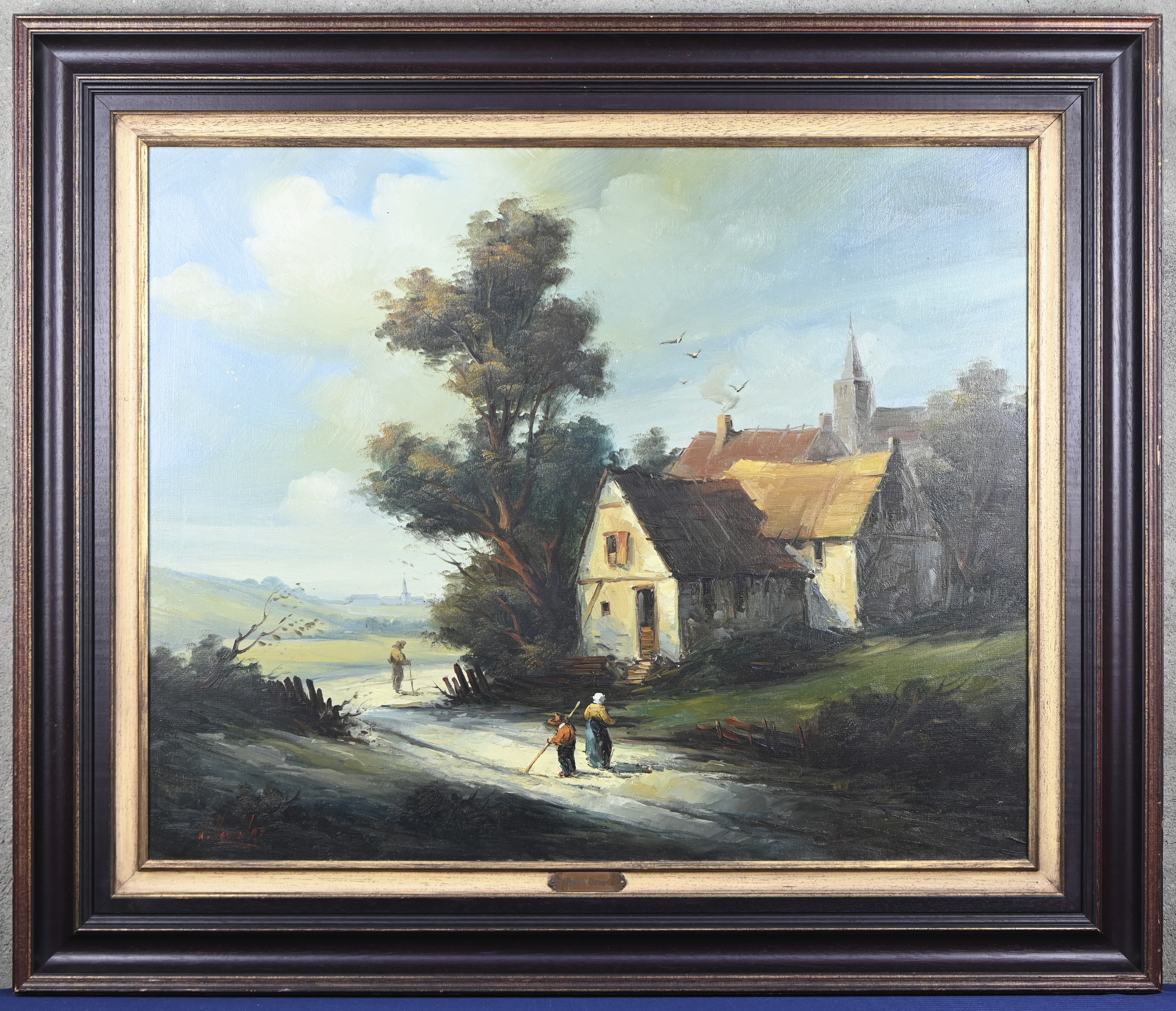 'Street scene with little tower', oil on canvas. Signed; De Moen. Impressionistic work in muted tones. -