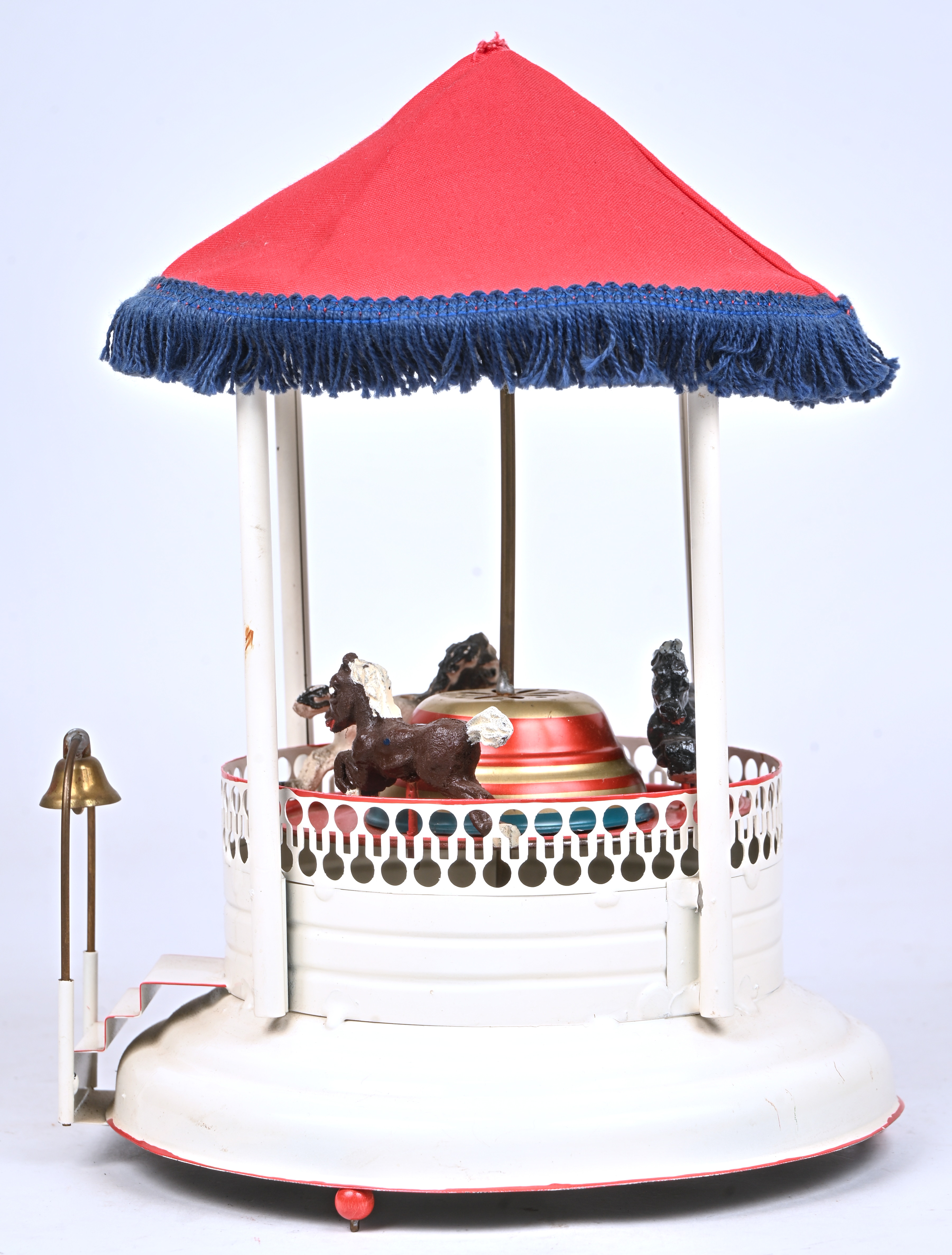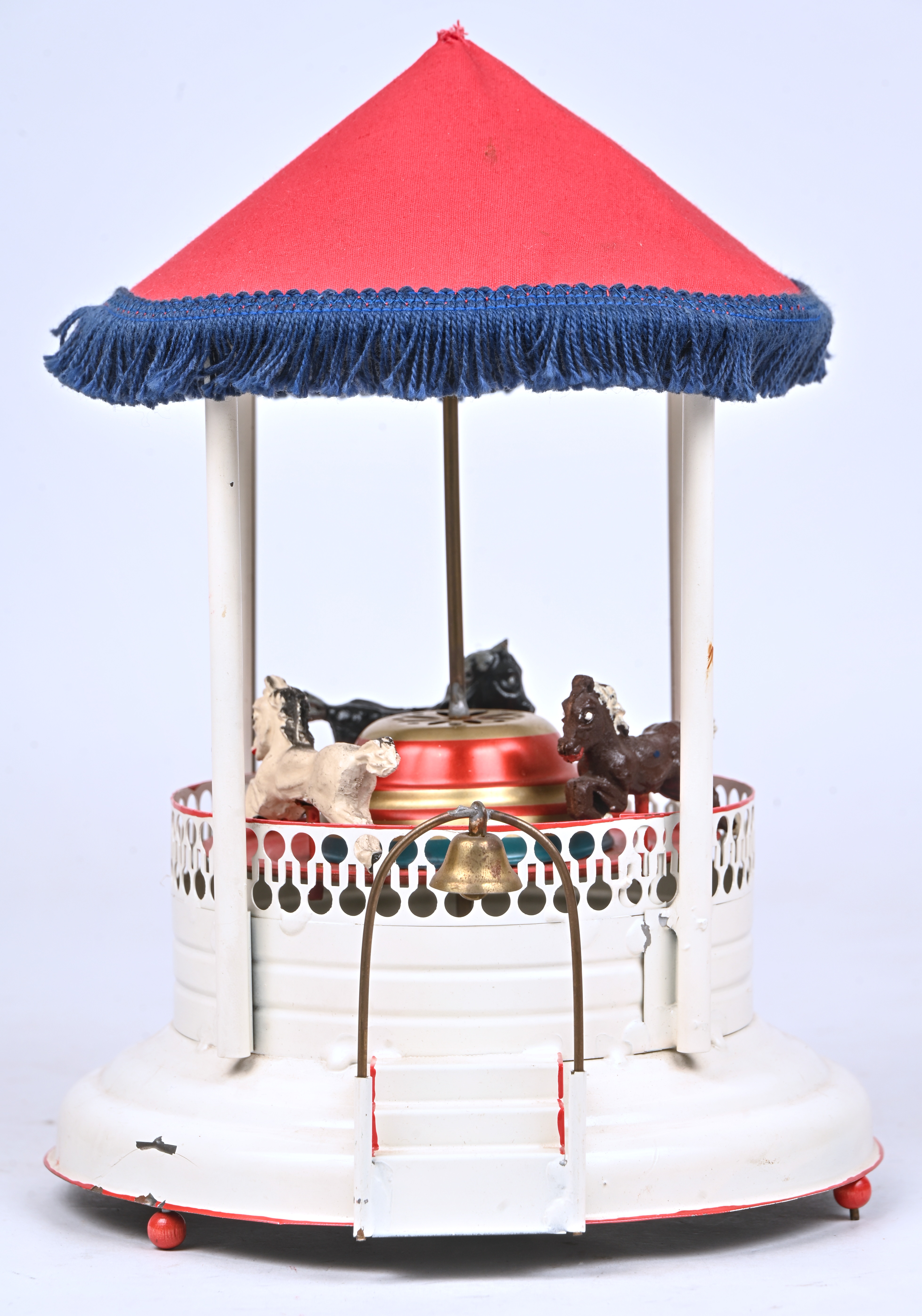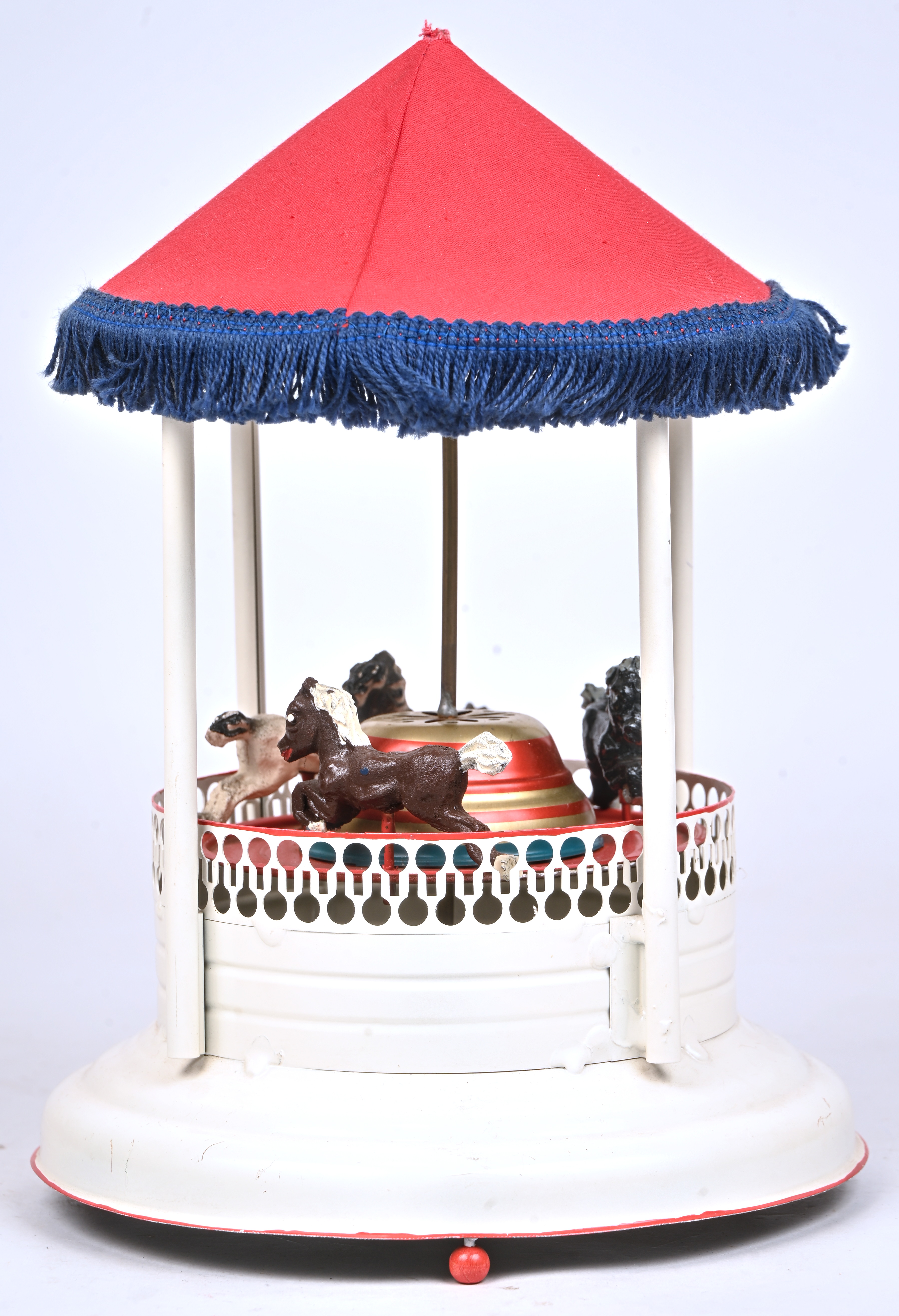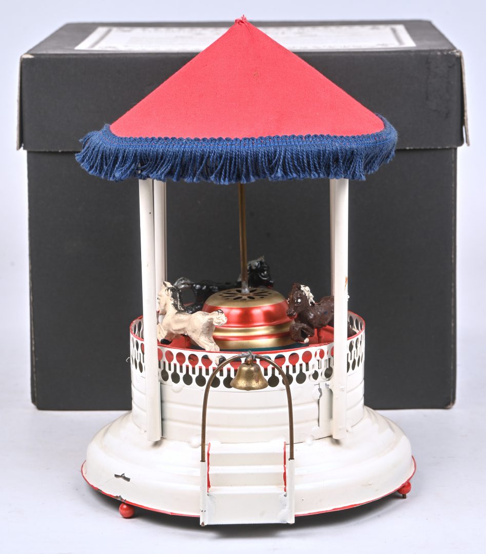 A wind-up tin carousel. Model T-155, number 253 out of an edition of 700 copies. The key is missing. -