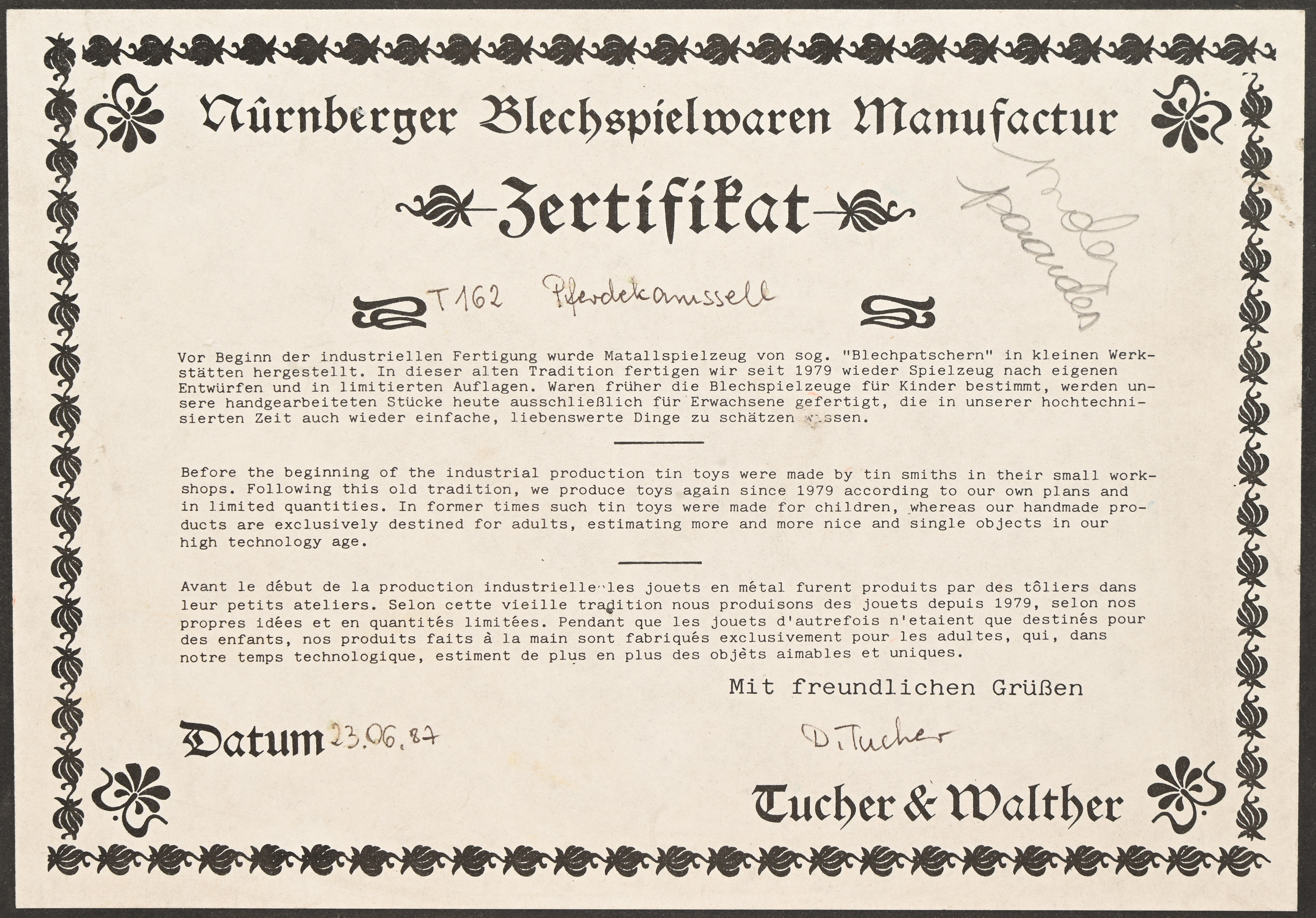 #22Nürnberger Bleichwaren Tucher & WalterTwee blikken straatvenders met een vliegwiel aangedreven karretje.